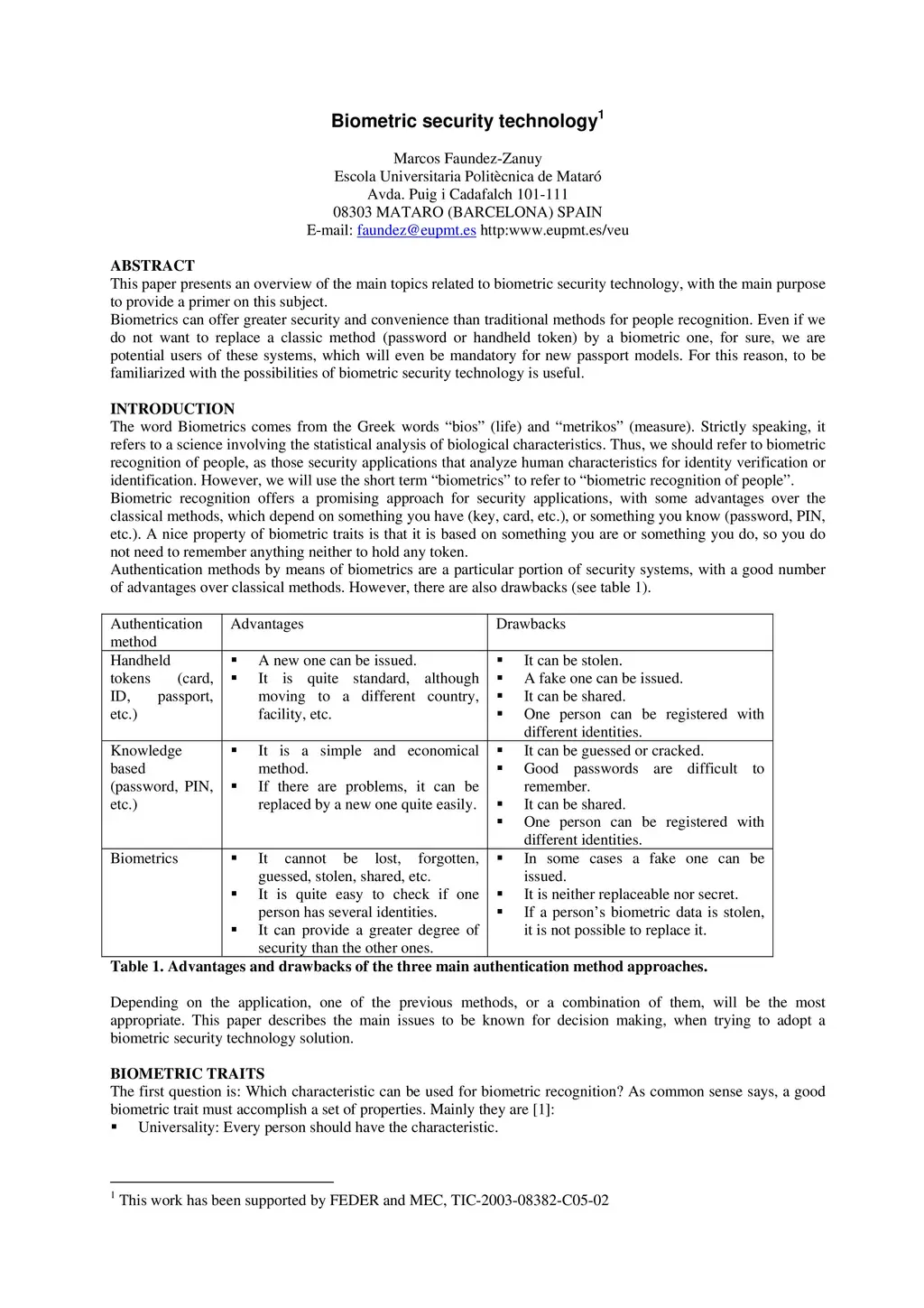 This paper presents an overview of the main topics related to biometric security technology, with the main purpose to provide a primer on this subject. Biometrics can offer greater security and convenience than traditional methods for people recognition. Even if we do not want to replace a classic method (password or handheld token) by a biometric one, for sure, we are potential users of these systems, which will even be mandatory for new passport models. For this reason, to be familiarized with the possibilities of biometric security technology is useful.