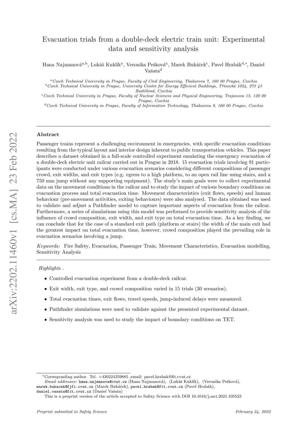 Passenger trains represent a challenging environment in emergencies, with specific evacuation conditions resulting from the typical layout and interior design inherent to public transportation vehicles. This paper describes a dataset obtained in a full-scale controlled experiment emulating the emergency evacuation of a double-deck electric unit railcar carried out in Prague in 2018. 15 evacuation trials involving 91 participants were conducted under various evacuation scenarios considering different compositions of passenger crowd, exit widths, and exit types (e.g. egress to a high platform, to an open rail line using stairs, and a 750 mm jump without any supporting equipment). The study's main goals were to collect experimental data on the movement conditions in the railcar and to study the impact of various boundary conditions on evacuation process and total evacuation time. Movement characteristics (exit flows, speeds) and human behaviour (pre-movement activities, exiting behaviours) were also analysed. The data obtained was used to validate and adjust a Pathfinder model to capture important aspects of evacuation from the railcar. Furthermore, a series of simulations using this model was performed to provide sensitivity analysis of the influence of crowd composition, exit width, and exit type on total evacuation time. As a key finding, we can conclude that for the case of a standard exit path (platform or stairs) the width of the main exit had the greatest impact on total evacuation time, however, crowd composition played the prevailing role in evacuation scenarios involving a jump.