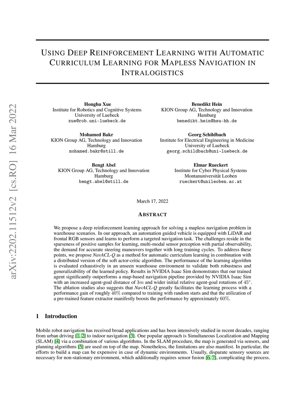 We propose a deep reinforcement learning approach for solving a mapless navigation problem in warehouse scenarios. In our approach, an automation guided vehicle is equipped with LiDAR and frontal RGB sensors and learns to perform a targeted navigation task. The challenges reside in the sparseness of positive samples for learning, multi-modal sensor perception with partial observability, the demand for accurate steering maneuvers together with long training cycles. To address these points, we propose NavACL-Q as a method for automatic curriculum learning in combination with a distributed version of the soft actor-critic algorithm. The performance of the learning algorithm is evaluated exhaustively in an unseen warehouse environment to validate both robustness and generalizability of the learned policy. Results in NVIDIA Isaac Sim demonstrates that our trained agent significantly outperforms a map-based navigation pipeline provided by NVIDIA Isaac Sim with an increased agent-goal distance of 3m and wider initial relative agent-goal rotations of 45 degree. The ablation studies also suggests that NavACL-Q greatly facilitates the learning process with a performance gain of roughly 40% compared to training with random starts and that the utilization of a pre-trained feature extractor manifestly boosts the performance by approximately 60%.