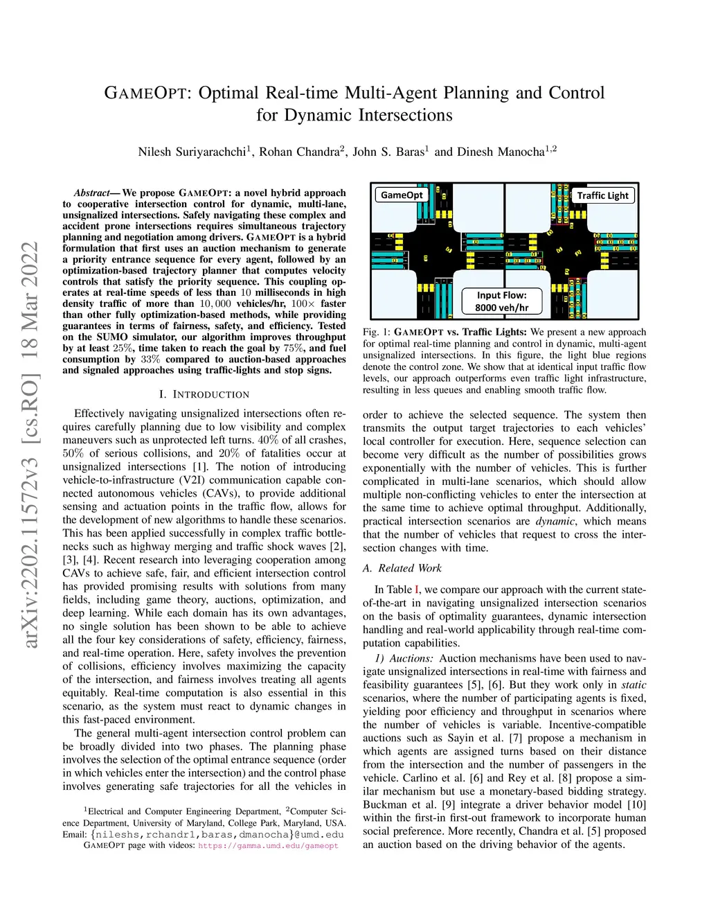 We propose GameOpt: a novel hybrid approach to cooperative intersection control for dynamic, multi-lane, unsignalized intersections. Safely navigating these complex and accident prone intersections requires simultaneous trajectory planning and negotiation among drivers. GameOpt is a hybrid formulation that first uses an auction mechanism to generate a priority entrance sequence for every agent, followed by an optimization-based trajectory planner that computes velocity controls that satisfy the priority sequence. This coupling operates at real-time speeds of less than 10 milliseconds in high density traffic of more than 10,000 vehicles/hr, 100 times faster than other fully optimization-based methods, while providing guarantees in terms of fairness, safety, and efficiency. Tested on the SUMO simulator, our algorithm improves throughput by at least 25%, time taken to reach the goal by 75%, and fuel consumption by 33% compared to auction-based approaches and signaled approaches using traffic-lights and stop signs.