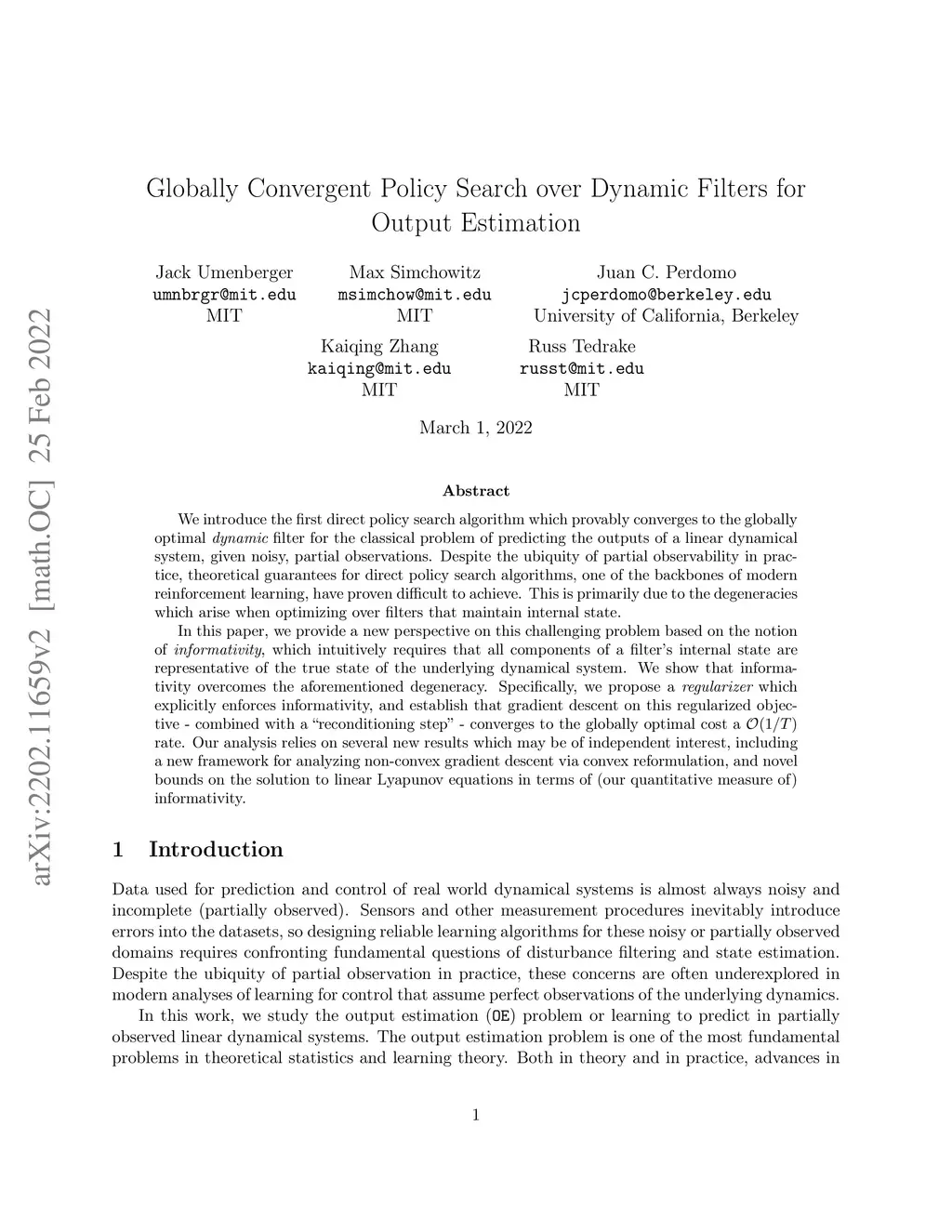 Globally Convergent Policy Search over Dynamic Filters for Output