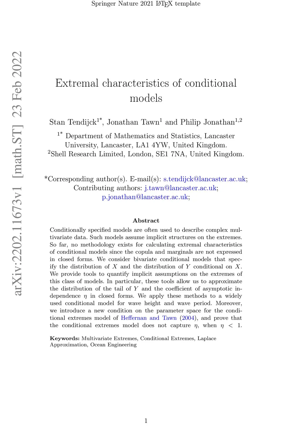 Conditionally specified models are often used to describe complex multivariate data. Such models assume implicit structures on the extremes. So far, no methodology exists for calculating extremal characteristics of conditional models since the copula and marginals are not expressed in closed forms. We consider bivariate conditional models that specify the distribution of and the distribution of conditional on . We provide tools to quantify implicit assumptions on the extremes of this class of models. In particular, these tools allow us to approximate the distribution of the tail of and the coefficient of asymptotic independence in closed forms. We apply these methods to a widely used conditional model for wave height and wave period. Moreover, we introduce a new condition on the parameter space for the conditional extremes model of Heffernan and Tawn (2004), and prove that the conditional extremes model does not capture , when .