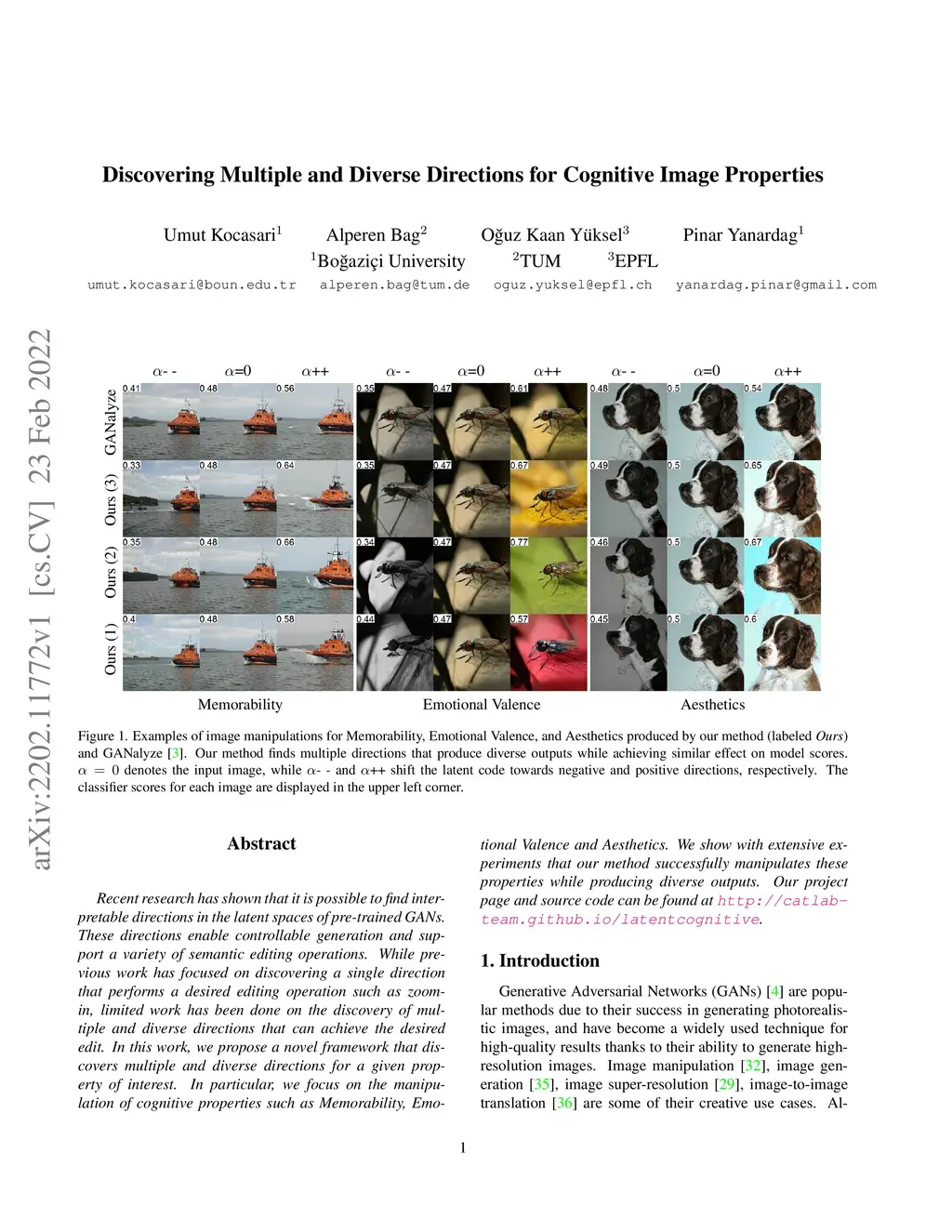 Recent research has shown that it is possible to find interpretable directions in the latent spaces of pre-trained GANs. These directions enable controllable generation and support a variety of semantic editing operations. While previous work has focused on discovering a single direction that performs a desired editing operation such as zoom-in, limited work has been done on the discovery of multiple and diverse directions that can achieve the desired edit. In this work, we propose a novel framework that discovers multiple and diverse directions for a given property of interest. In particular, we focus on the manipulation of cognitive properties such as Memorability, Emotional Valence and Aesthetics. We show with extensive experiments that our method successfully manipulates these properties while producing diverse outputs. Our project page and source code can be found at http://catlab-team.github.io/latentcognitive.