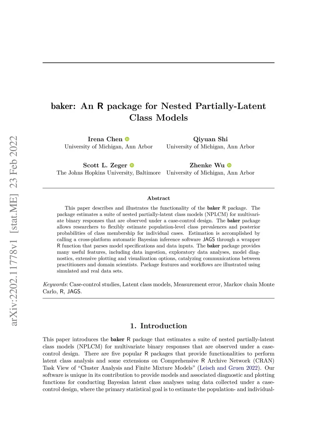 This paper describes and illustrates the functionality of the baker R package. The package estimates a suite of nested partially-latent class models (NPLCM) for multivariate binary responses that are observed under a case-control design. The baker package allows researchers to flexibly estimate population-level class prevalences and posterior probabilities of class membership for individual cases. Estimation is accomplished by calling a cross-platform automatic Bayesian inference software JAGS through a wrapper R function that parses model specifications and data inputs. The baker package provides many useful features, including data ingestion, exploratory data analyses, model diagnostics, extensive plotting and visualization options, catalyzing communications between practitioners and domain scientists. Package features and workflows are illustrated using simulated and real data sets. Package URL: https://github.com/zhenkewu/baker