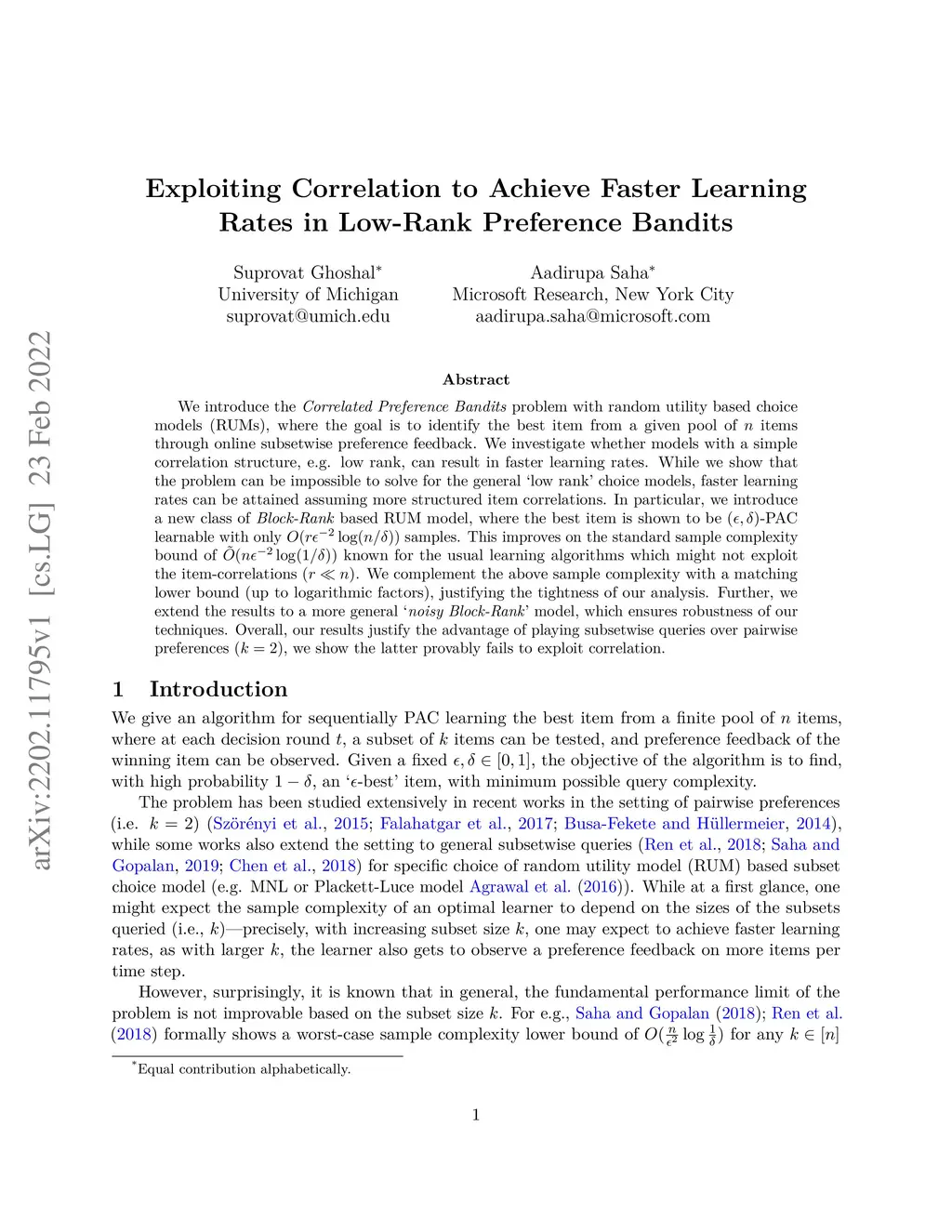 We introduce the \emph{Correlated Preference Bandits} problem with random utility-based choice models (RUMs), where the goal is to identify the best item from a given pool of items through online subsetwise preference feedback. We investigate whether models with a simple correlation structure, e.g. low rank, can result in faster learning rates. While we show that the problem can be impossible to solve for the general `low rank' choice models, faster learning rates can be attained assuming more structured item correlations. In particular, we introduce a new class of \emph{Block-Rank} based RUM model, where the best item is shown to be -PAC learnable with only samples. This improves on the standard sample complexity bound of known for the usual learning algorithms which might not exploit the item-correlations (). We complement the above sample complexity with a matching lower bound (up to logarithmic factors), justifying the tightness of our analysis. Surprisingly, we also show a lower bound of when the learner is forced to play just duels instead of larger subsetwise queries. Further, we extend the results to a more general `\emph{noisy Block-Rank}' model, which ensures robustness of our techniques. Overall, our results justify the advantage of playing subsetwise queries over pairwise preferences , we show the latter provably fails to exploit correlation.