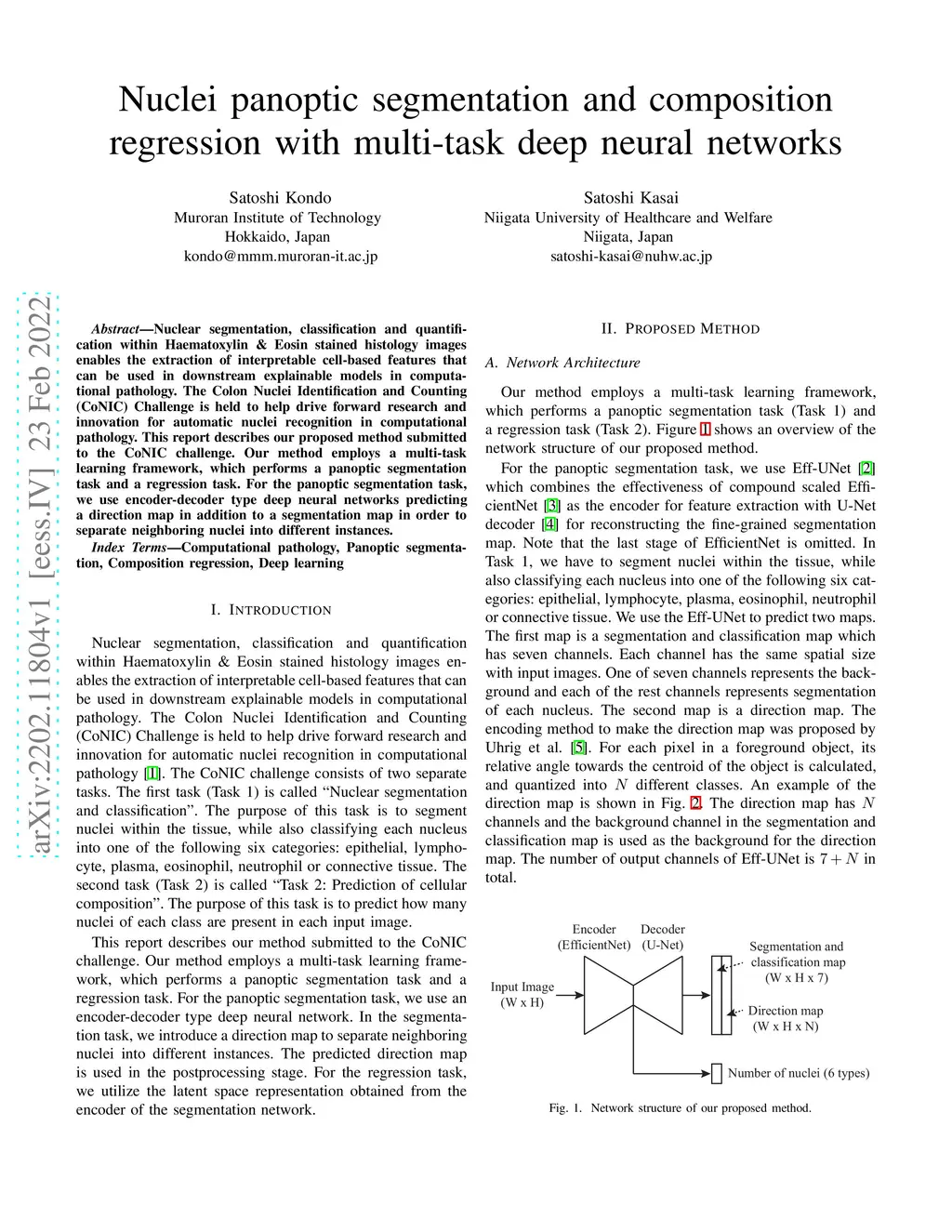 Nuclear segmentation, classification and quantification within Haematoxylin & Eosin stained histology images enables the extraction of interpretable cell-based features that can be used in downstream explainable models in computational pathology. The Colon Nuclei Identification and Counting (CoNIC) Challenge is held to help drive forward research and innovation for automatic nuclei recognition in computational pathology. This report describes our proposed method submitted to the CoNIC challenge. Our method employs a multi-task learning framework, which performs a panoptic segmentation task and a regression task. For the panoptic segmentation task, we use encoder-decoder type deep neural networks predicting a direction map in addition to a segmentation map in order to separate neighboring nuclei into different instances