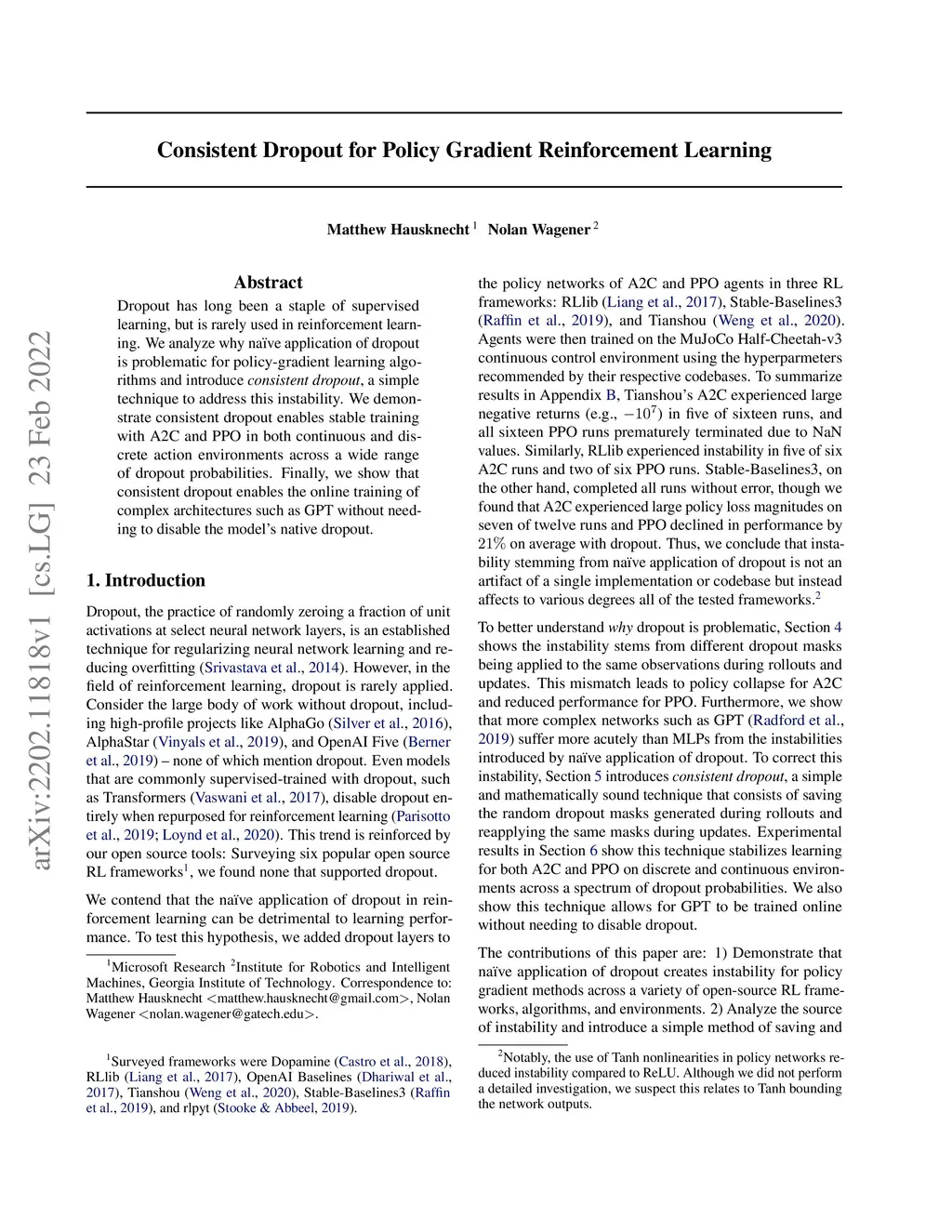 Consistent Dropout for Policy Gradient Reinforcement Learning