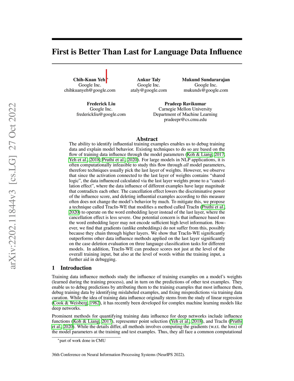 The ability to identify influential training examples enables us to debug training data and explain model behavior. Existing techniques to do so are based on the flow of training data influence through the model parameters. For large models in NLP applications, it is often computationally infeasible to study this flow through all model parameters, therefore techniques usually pick the last layer of weights. However, we observe that since the activation connected to the last layer of weights contains "shared logic", the data influenced calculated via the last layer weights prone to a ``cancellation effect'', where the data influence of different examples have large magnitude that contradicts each other. The cancellation effect lowers the discriminative power of the influence score, and deleting influential examples according to this measure often does not change the model's behavior by much. To mitigate this, we propose a technique called TracIn-WE that modifies a method called TracIn to operate on the word embedding layer instead of the last layer, where the cancellation effect is less severe. One potential concern is that influence based on the word embedding layer may not encode sufficient high level information. However, we find that gradients (unlike embeddings) do not suffer from this, possibly because they chain through higher layers. We show that TracIn-WE significantly outperforms other data influence methods applied on the last layer significantly on the case deletion evaluation on three language classification tasks for different models. In addition, TracIn-WE can produce scores not just at the level of the overall training input, but also at the level of words within the training input, a further aid in debugging.