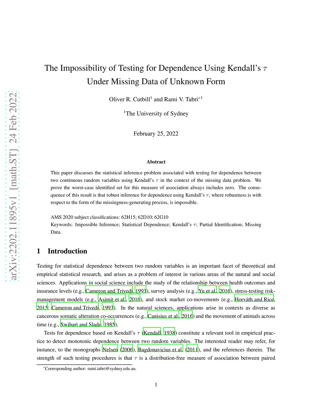 This paper discusses the statistical inference problem associated with testing for dependence between two continuous random variables using Kendall's in the context of the missing data problem. We prove the worst-case identified set for this measure of association always includes zero. The consequence of this result is that robust inference for dependence using Kendall's , where robustness is with respect to the form of the missingness-generating process, is impossible.