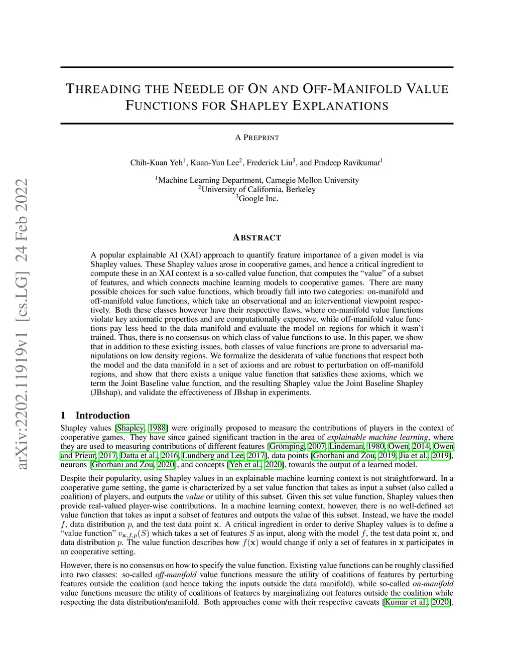 A popular explainable AI (XAI) approach to quantify feature importance of a given model is via Shapley values. These Shapley values arose in cooperative games, and hence a critical ingredient to compute these in an XAI context is a so-called value function, that computes the "value" of a subset of features, and which connects machine learning models to cooperative games. There are many possible choices for such value functions, which broadly fall into two categories: on-manifold and off-manifold value functions, which take an observational and an interventional viewpoint respectively. Both these classes however have their respective flaws, where on-manifold value functions violate key axiomatic properties and are computationally expensive, while off-manifold value functions pay less heed to the data manifold and evaluate the model on regions for which it wasn't trained. Thus, there is no consensus on which class of value functions to use. In this paper, we show that in addition to these existing issues, both classes of value functions are prone to adversarial manipulations on low density regions. We formalize the desiderata of value functions that respect both the model and the data manifold in a set of axioms and are robust to perturbation on off-manifold regions, and show that there exists a unique value function that satisfies these axioms, which we term the Joint Baseline value function, and the resulting Shapley value the Joint Baseline Shapley (JBshap), and validate the effectiveness of JBshap in experiments.