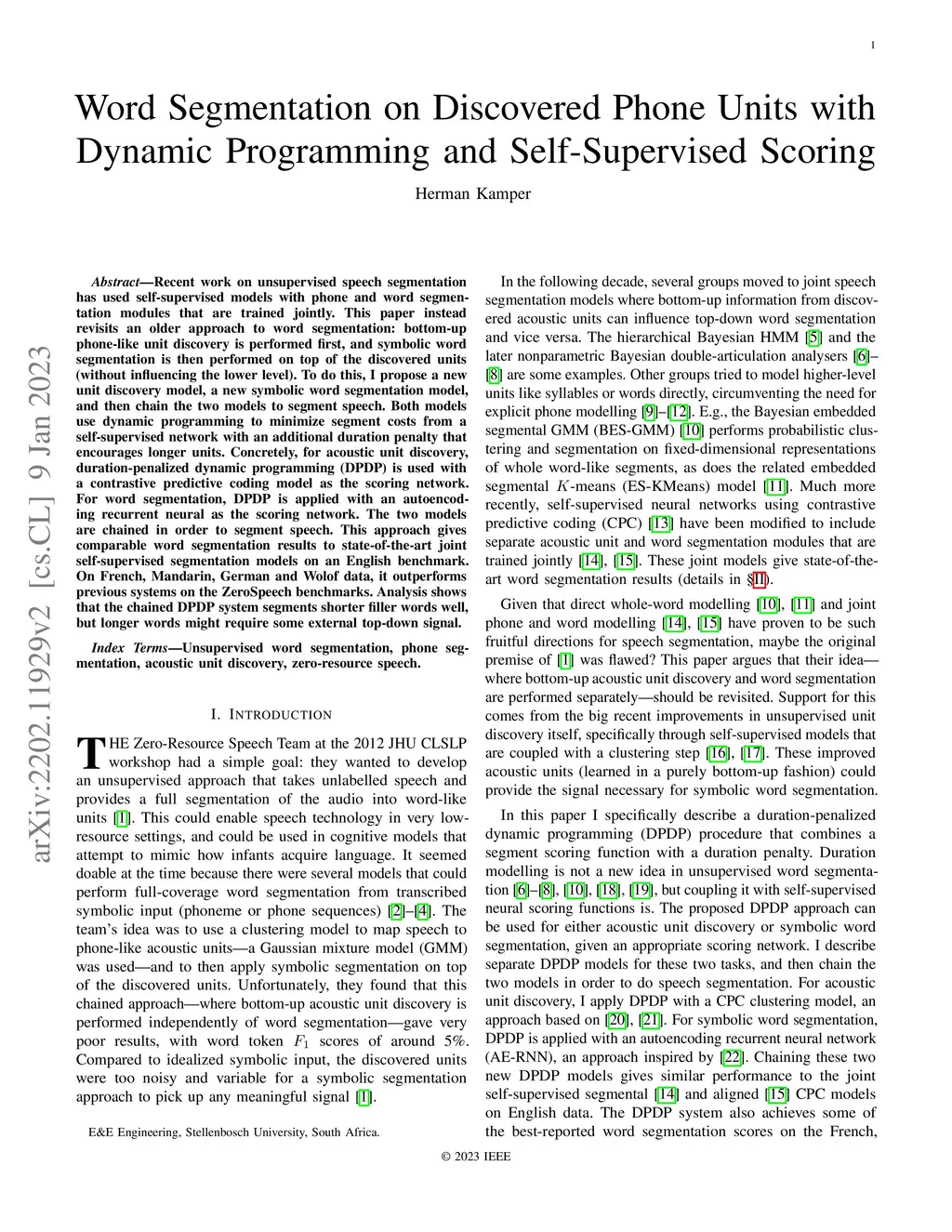 Recent work on unsupervised speech segmentation has used self-supervised models with phone and word segmentation modules that are trained jointly. This paper instead revisits an older approach to word segmentation: bottom-up phone-like unit discovery is performed first, and symbolic word segmentation is then performed on top of the discovered units (without influencing the lower level). To do this, I propose a new unit discovery model, a new symbolic word segmentation model, and then chain the two models to segment speech. Both models use dynamic programming to minimize segment costs from a self-supervised network with an additional duration penalty that encourages longer units. Concretely, for acoustic unit discovery, duration-penalized dynamic programming (DPDP) is used with a contrastive predictive coding model as the scoring network. For word segmentation, DPDP is applied with an autoencoding recurrent neural as the scoring network. The two models are chained in order to segment speech. This approach gives comparable word segmentation results to state-of-the-art joint self-supervised segmentation models on an English benchmark. On French, Mandarin, German and Wolof data, it outperforms previous systems on the ZeroSpeech benchmarks. Analysis shows that the chained DPDP system segments shorter filler words well, but longer words might require some external top-down signal.