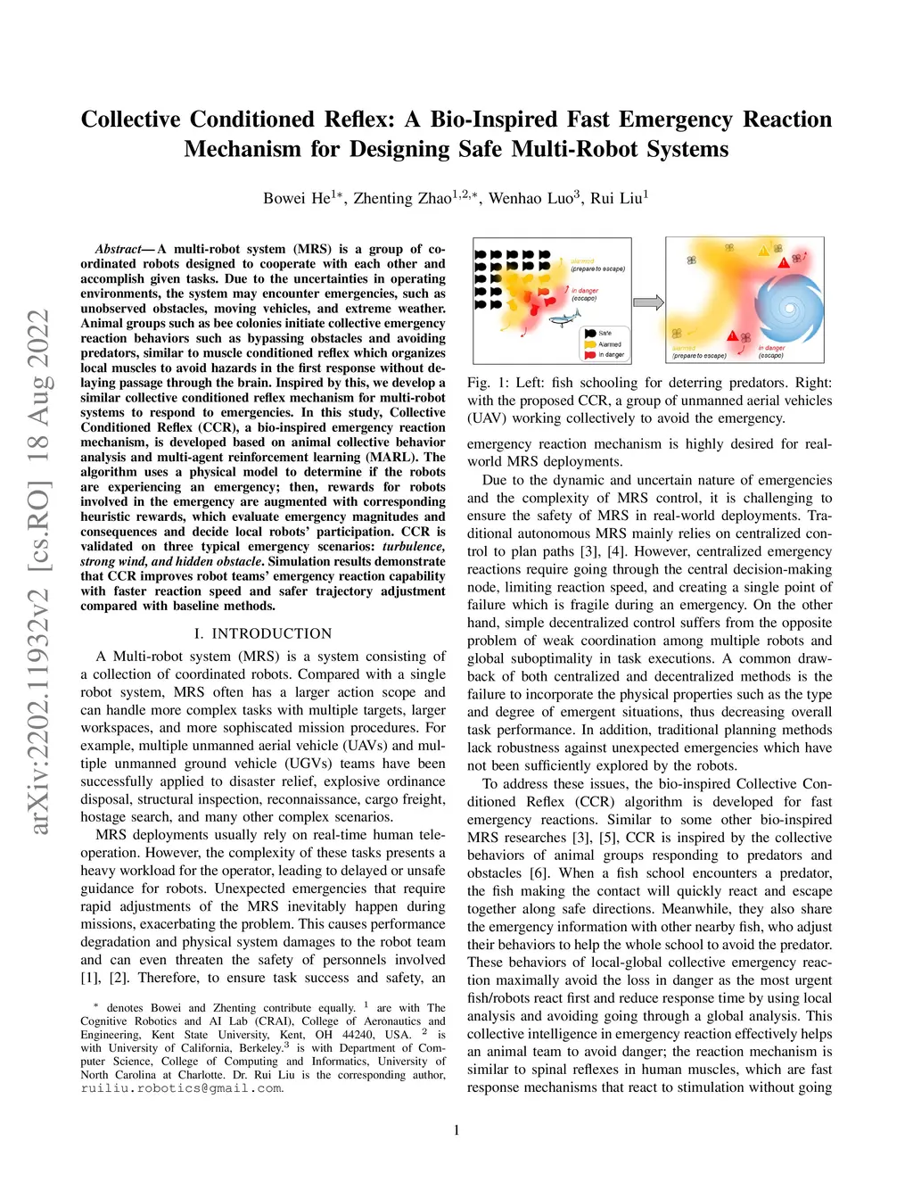 A multi-robot system (MRS) is a group of coordinated robots designed to cooperate with each other and accomplish given tasks. Due to the uncertainties in operating environments, the system may encounter emergencies, such as unobserved obstacles, moving vehicles, and extreme weather. Animal groups such as bee colonies initiate collective emergency reaction behaviors such as bypassing obstacles and avoiding predators, similar to muscle-conditioned reflex which organizes local muscles to avoid hazards in the first response without delaying passage through the brain. Inspired by this, we develop a similar collective conditioned reflex mechanism for multi-robot systems to respond to emergencies. In this study, Collective Conditioned Reflex (CCR), a bio-inspired emergency reaction mechanism, is developed based on animal collective behavior analysis and multi-agent reinforcement learning (MARL). The algorithm uses a physical model to determine if the robots are experiencing an emergency; then, rewards for robots involved in the emergency are augmented with corresponding heuristic rewards, which evaluate emergency magnitudes and consequences and decide local robots' participation. CCR is validated on three typical emergency scenarios: \textit{turbulence, strong wind, and hidden obstacle}. Simulation results demonstrate that CCR improves robot teams' emergency reaction capability with faster reaction speed and safer trajectory adjustment compared with baseline methods.