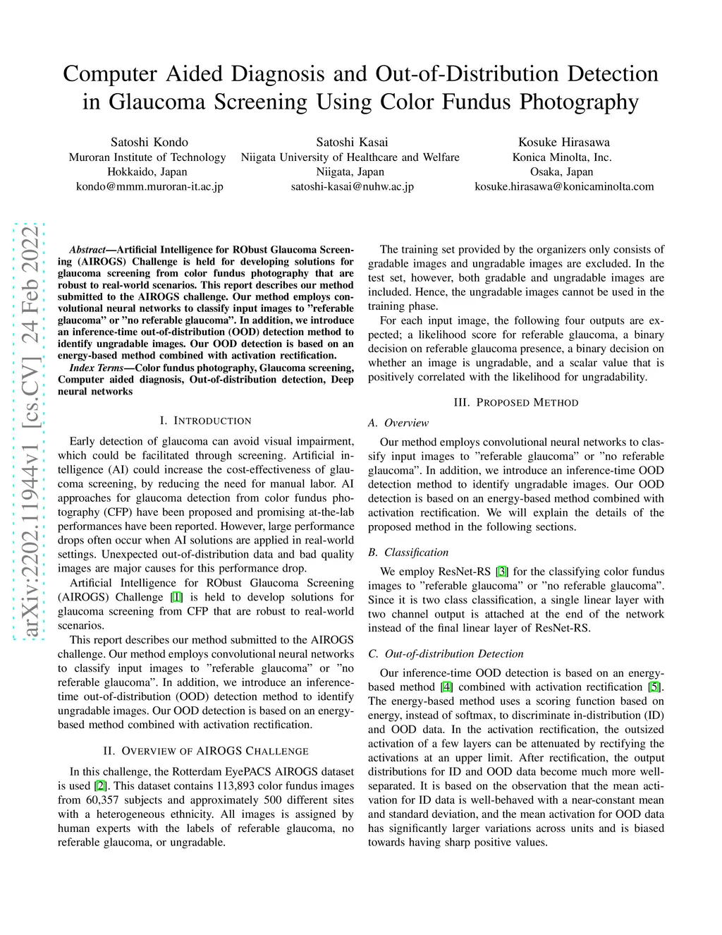 Artificial Intelligence for RObust Glaucoma Screening (AIROGS) Challenge is held for developing solutions for glaucoma screening from color fundus photography that are robust to real-world scenarios. This report describes our method submitted to the AIROGS challenge. Our method employs convolutional neural networks to classify input images to "referable glaucoma" or "no referable glaucoma". In addition, we introduce an inference-time out-of-distribution (OOD) detection method to identify ungradable images. Our OOD detection is based on an energy-based method combined with activation rectification.