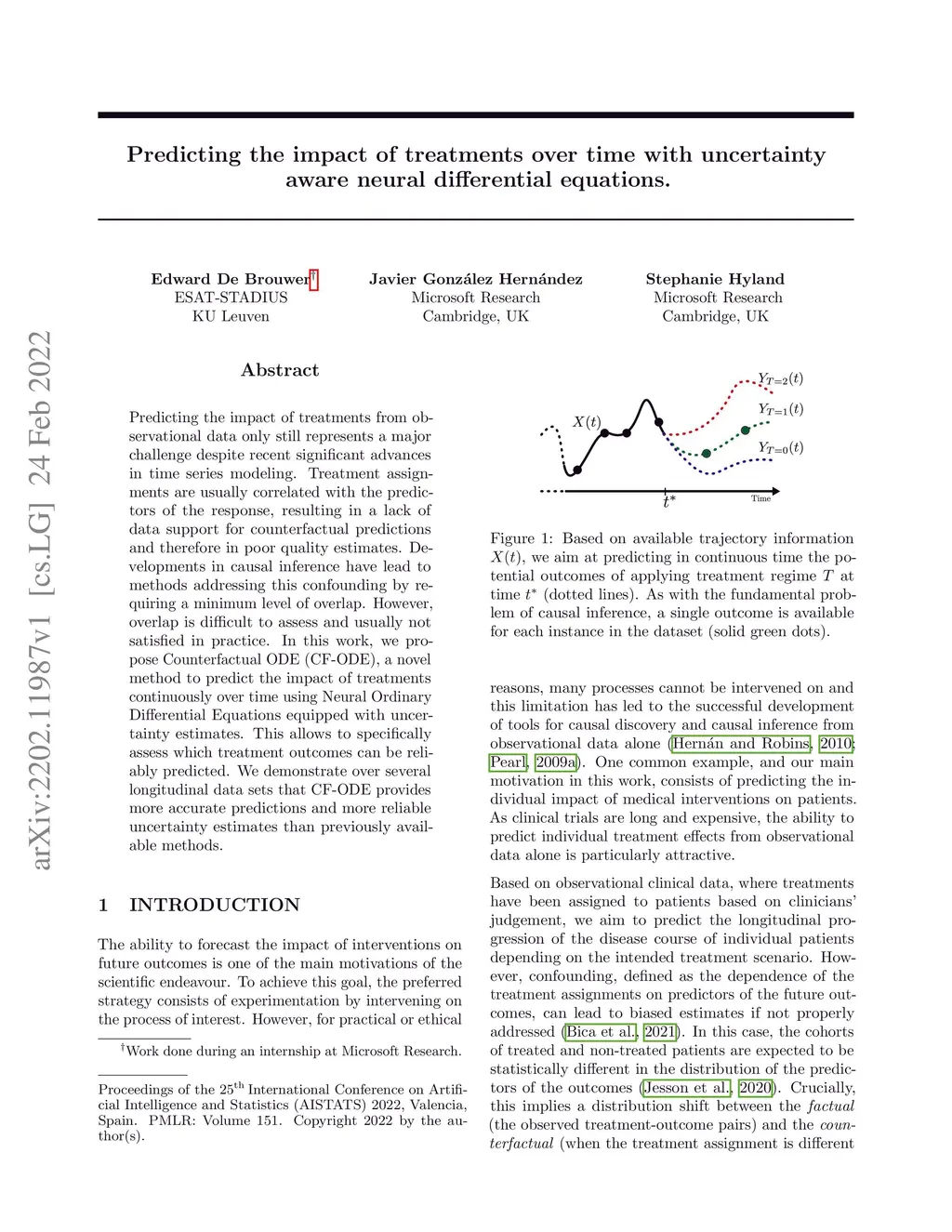 Predicting the impact of treatments from observational data only still represents a majorchallenge despite recent significant advances in time series modeling. Treatment assignments are usually correlated with the predictors of the response, resulting in a lack of data support for counterfactual predictions and therefore in poor quality estimates. Developments in causal inference have lead to methods addressing this confounding by requiring a minimum level of overlap. However,overlap is difficult to assess and usually notsatisfied in practice. In this work, we propose Counterfactual ODE (CF-ODE), a novel method to predict the impact of treatments continuously over time using Neural Ordinary Differential Equations equipped with uncertainty estimates. This allows to specifically assess which treatment outcomes can be reliably predicted. We demonstrate over several longitudinal data sets that CF-ODE provides more accurate predictions and more reliable uncertainty estimates than previously available methods.