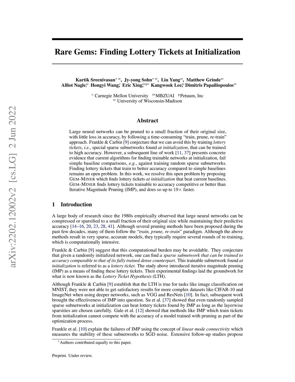 Large neural networks can be pruned to a small fraction of their original size, with little loss in accuracy, by following a time-consuming "train, prune, re-train" approach. Frankle & Carbin conjecture that we can avoid this by training "lottery tickets", i.e., special sparse subnetworks found at initialization, that can be trained to high accuracy. However, a subsequent line of work by Frankle et al. and Su et al. presents concrete evidence that current algorithms for finding trainable networks at initialization, fail simple baseline comparisons, e.g., against training random sparse subnetworks. Finding lottery tickets that train to better accuracy compared to simple baselines remains an open problem. In this work, we resolve this open problem by proposing Gem-Miner which finds lottery tickets at initialization that beat current baselines. Gem-Miner finds lottery tickets trainable to accuracy competitive or better than Iterative Magnitude Pruning (IMP), and does so up to faster.