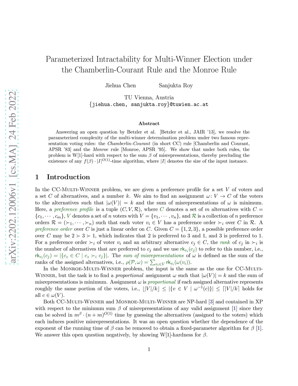 Answering an open question by Betzler et al. [Betzler et al., JAIR'13], we resolve the parameterized complexity of the multi-winner determination problem under two famous representation voting rules: the Chamberlin-Courant (in short CC) rule [Chamberlin and Courant, APSR'83] and the Monroe rule [Monroe, APSR'95]. We show that under both rules, the problem is W[1]-hard with respect to the sum of misrepresentations, thereby precluding the existence of any -time algorithm, where denotes the size of the input instance.