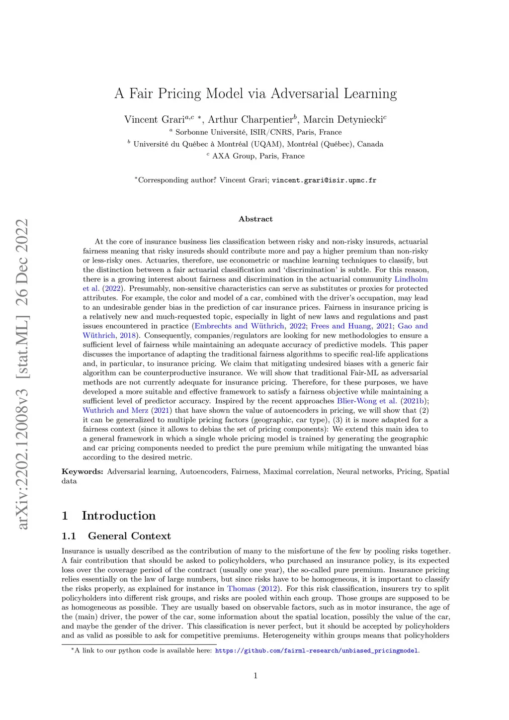 At the core of insurance business lies classification between risky and non-risky insureds, actuarial fairness meaning that risky insureds should contribute more and pay a higher premium than non-risky or less-risky ones. Actuaries, therefore, use econometric or machine learning techniques to classify, but the distinction between a fair actuarial classification and "discrimination" is subtle. For this reason, there is a growing interest about fairness and discrimination in the actuarial community Lindholm, Richman, Tsanakas, and Wuthrich (2022). Presumably, non-sensitive characteristics can serve as substitutes or proxies for protected attributes. For example, the color and model of a car, combined with the driver's occupation, may lead to an undesirable gender bias in the prediction of car insurance prices. Surprisingly, we will show that debiasing the predictor alone may be insufficient to maintain adequate accuracy (1). Indeed, the traditional pricing model is currently built in a two-stage structure that considers many potentially biased components such as car or geographic risks. We will show that this traditional structure has significant limitations in achieving fairness. For this reason, we have developed a novel pricing model approach. Recently some approaches have Blier-Wong, Cossette, Lamontagne, and Marceau (2021); Wuthrich and Merz (2021) shown the value of autoencoders in pricing. In this paper, we will show that (2) this can be generalized to multiple pricing factors (geographic, car type), (3) it perfectly adapted for a fairness context (since it allows to debias the set of pricing components): We extend this main idea to a general framework in which a single whole pricing model is trained by generating the geographic and car pricing components needed to predict the pure premium while mitigating the unwanted bias according to the desired metric.