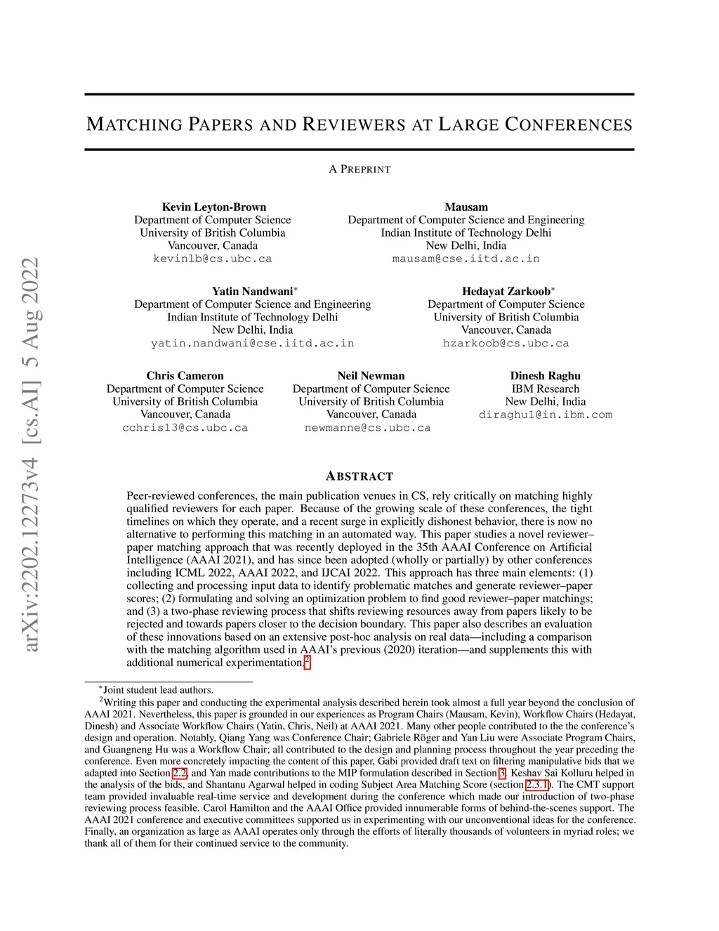 Peer-reviewed conferences, the main publication venues in CS, rely critically on matching highly qualified reviewers for each paper. Because of the growing scale of these conferences, the tight timelines on which they operate, and a recent surge in explicitly dishonest behavior, there is now no alternative to performing this matching in an automated way. This paper studies a novel reviewer-paper matching approach that was recently deployed in the 35th AAAI Conference on Artificial Intelligence (AAAI 2021), and has since been adopted (wholly or partially) by other conferences including ICML 2022, AAAI 2022, and IJCAI 2022. This approach has three main elements: (1) collecting and processing input data to identify problematic matches and generate reviewer-paper scores; (2) formulating and solving an optimization problem to find good reviewer-paper matchings; and (3) a two-phase reviewing process that shifts reviewing resources away from papers likely to be rejected and towards papers closer to the decision boundary. This paper also describes an evaluation of these innovations based on an extensive post-hoc analysis on real data -- including a comparison with the matching algorithm used in AAAI's previous (2020) iteration -- and supplements this with additional numerical experimentation.