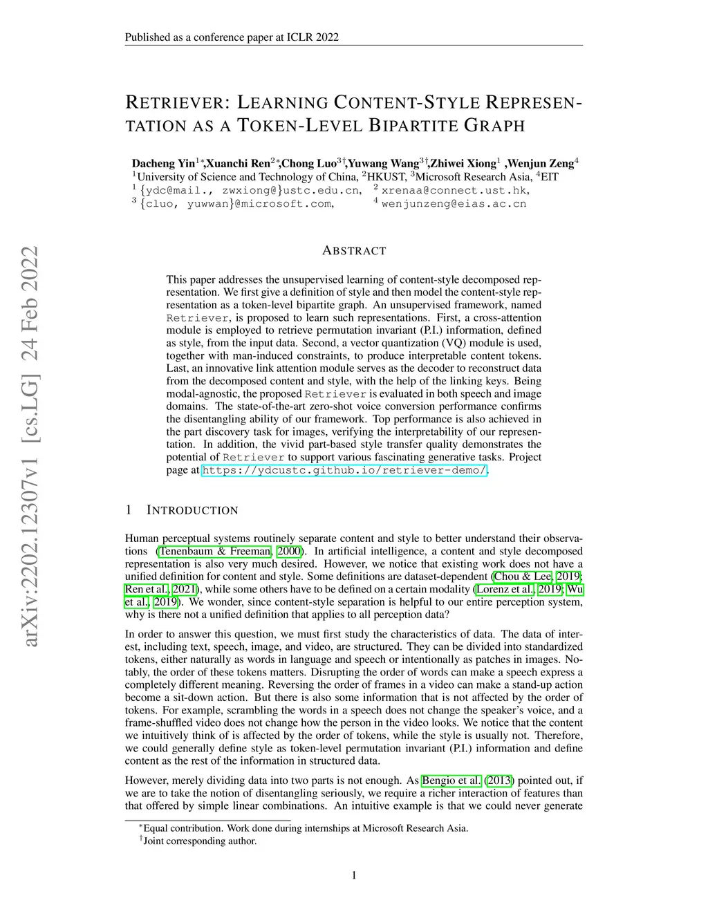This paper addresses the unsupervised learning of content-style decomposed representation. We first give a definition of style and then model the content-style representation as a token-level bipartite graph. An unsupervised framework, named Retriever, is proposed to learn such representations. First, a cross-attention module is employed to retrieve permutation invariant (P.I.) information, defined as style, from the input data. Second, a vector quantization (VQ) module is used, together with man-induced constraints, to produce interpretable content tokens. Last, an innovative link attention module serves as the decoder to reconstruct data from the decomposed content and style, with the help of the linking keys. Being modal-agnostic, the proposed Retriever is evaluated in both speech and image domains. The state-of-the-art zero-shot voice conversion performance confirms the disentangling ability of our framework. Top performance is also achieved in the part discovery task for images, verifying the interpretability of our representation. In addition, the vivid part-based style transfer quality demonstrates the potential of Retriever to support various fascinating generative tasks. Project page at https://ydcustc.github.io/retriever-demo/.