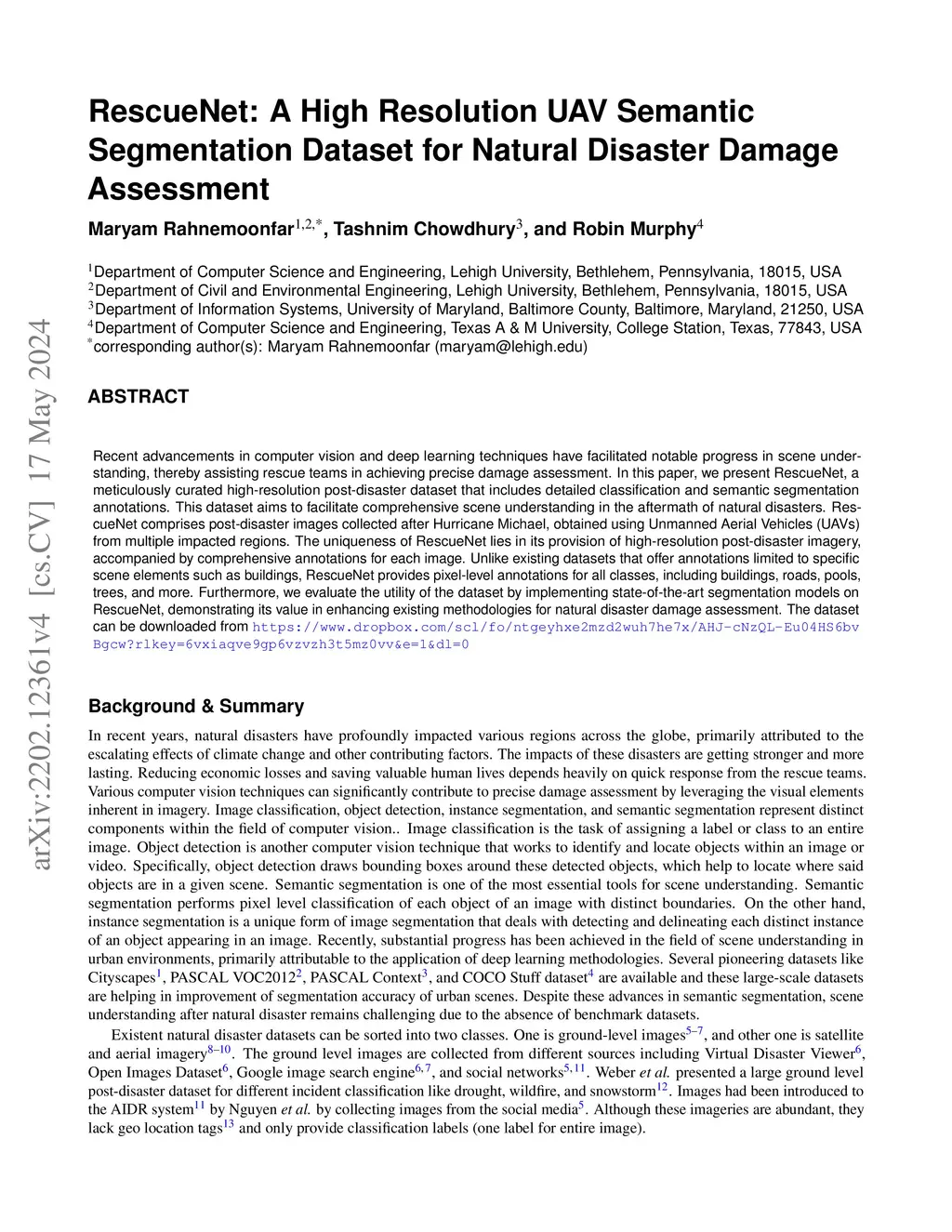 RescueNet: A High Resolution UAV Semantic Segmentation Benchmark Dataset