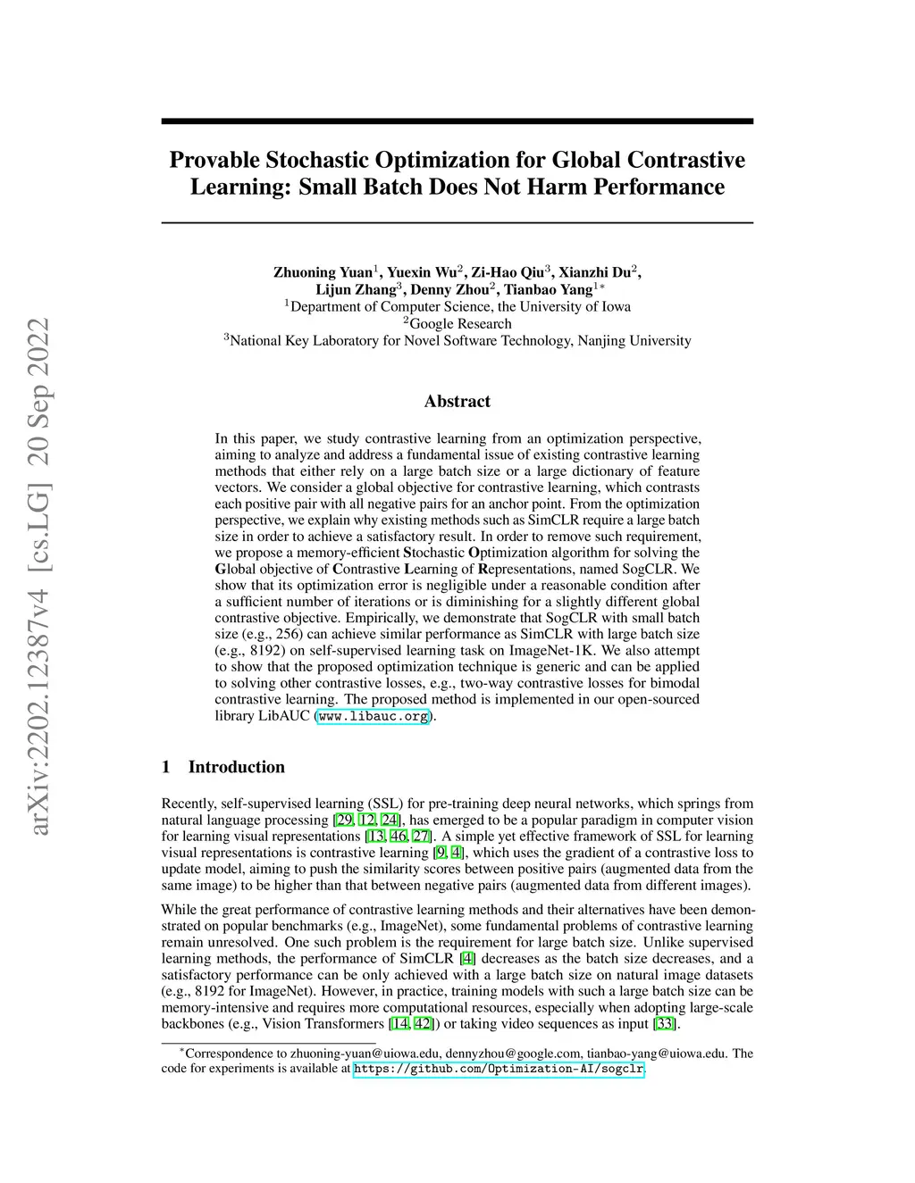 Provable Stochastic Optimization for Global Contrastive Learning: Small