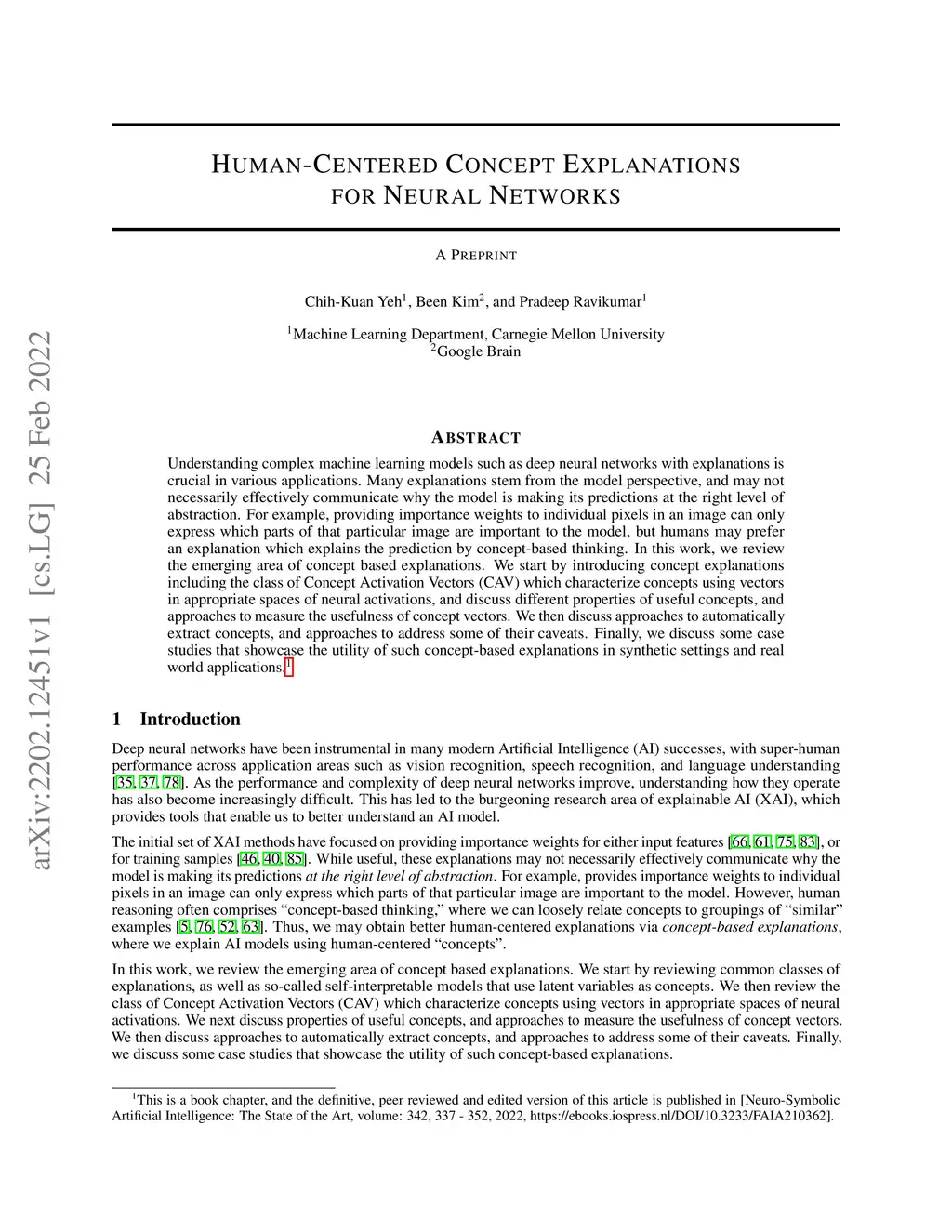 Understanding complex machine learning models such as deep neural networks with explanations is crucial in various applications. Many explanations stem from the model perspective, and may not necessarily effectively communicate why the model is making its predictions at the right level of abstraction. For example, providing importance weights to individual pixels in an image can only express which parts of that particular image are important to the model, but humans may prefer an explanation which explains the prediction by concept-based thinking. In this work, we review the emerging area of concept based explanations. We start by introducing concept explanations including the class of Concept Activation Vectors (CAV) which characterize concepts using vectors in appropriate spaces of neural activations, and discuss different properties of useful concepts, and approaches to measure the usefulness of concept vectors. We then discuss approaches to automatically extract concepts, and approaches to address some of their caveats. Finally, we discuss some case studies that showcase the utility of such concept-based explanations in synthetic settings and real world applications.