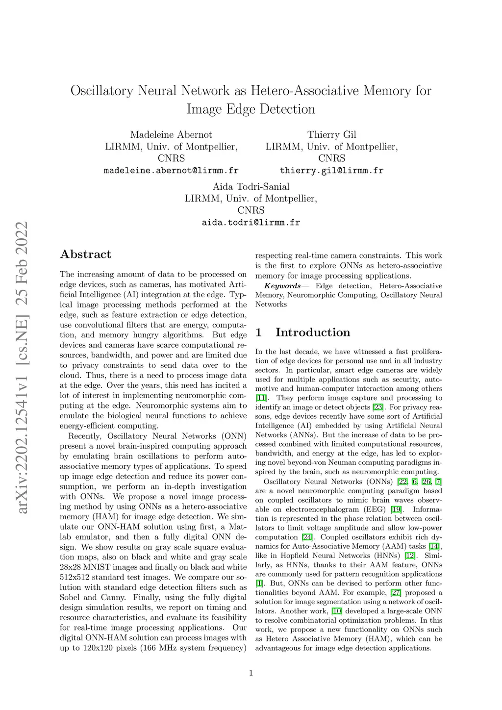 The increasing amount of data to be processed on edge devices, such as cameras, has motivated Artificial Intelligence (AI) integration at the edge. Typical image processing methods performed at the edge, such as feature extraction or edge detection, use convolutional filters that are energy, computation, and memory hungry algorithms. But edge devices and cameras have scarce computational resources, bandwidth, and power and are limited due to privacy constraints to send data over to the cloud. Thus, there is a need to process image data at the edge. Over the years, this need has incited a lot of interest in implementing neuromorphic computing at the edge. Neuromorphic systems aim to emulate the biological neural functions to achieve energy-efficient computing. Recently, Oscillatory Neural Networks (ONN) present a novel brain-inspired computing approach by emulating brain oscillations to perform autoassociative memory types of applications. To speed up image edge detection and reduce its power consumption, we perform an in-depth investigation with ONNs. We propose a novel image processing method by using ONNs as a hetero-associative memory (HAM) for image edge detection. We simulate our ONN-HAM solution using first, a Matlab emulator, and then a fully digital ONN design. We show results on gray scale square evaluation maps, also on black and white and gray scale 28x28 MNIST images and finally on black and white 512x512 standard test images. We compare our solution with standard edge detection filters such as Sobel and Canny. Finally, using the fully digital design simulation results, we report on timing and resource characteristics, and evaluate its feasibility for real-time image processing applications. Our digital ONN-HAM solution can process images with up to 120x120 pixels (166 MHz system frequency) respecting real-time camera constraints. This work is the first to explore ONNs as hetero-associative memory for image processing applications.