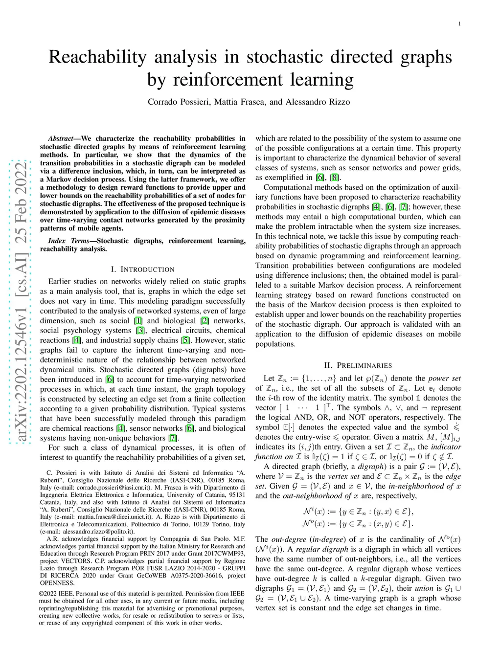 We characterize the reachability probabilities in stochastic directed graphs by means of reinforcement learning methods. In particular, we show that the dynamics of the transition probabilities in a stochastic digraph can be modeled via a difference inclusion, which, in turn, can be interpreted as a Markov decision process. Using the latter framework, we offer a methodology to design reward functions to provide upper and lower bounds on the reachability probabilities of a set of nodes for stochastic digraphs. The effectiveness of the proposed technique is demonstrated by application to the diffusion of epidemic diseases over time-varying contact networks generated by the proximity patterns of mobile agents.