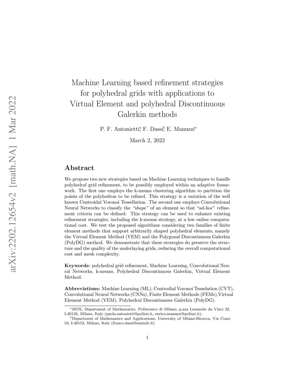 We propose two new strategies based on Machine Learning techniques to handle polyhedral grid refinement, to be possibly employed within an adaptive framework. The first one employs the k-means clustering algorithm to partition the points of the polyhedron to be refined. This strategy is a variation of the well known Centroidal Voronoi Tessellation. The second one employs Convolutional Neural Networks to classify the "shape" of an element so that "ad-hoc" refinement criteria can be defined. This strategy can be used to enhance existing refinement strategies, including the k-means strategy, at a low online computational cost. We test the proposed algorithms considering two families of finite element methods that support arbitrarily shaped polyhedral elements, namely the Virtual Element Method (VEM) and the Polygonal Discontinuous Galerkin (PolyDG) method. We demonstrate that these strategies do preserve the structure and the quality of the underlaying grids, reducing the overall computational cost and mesh complexity.