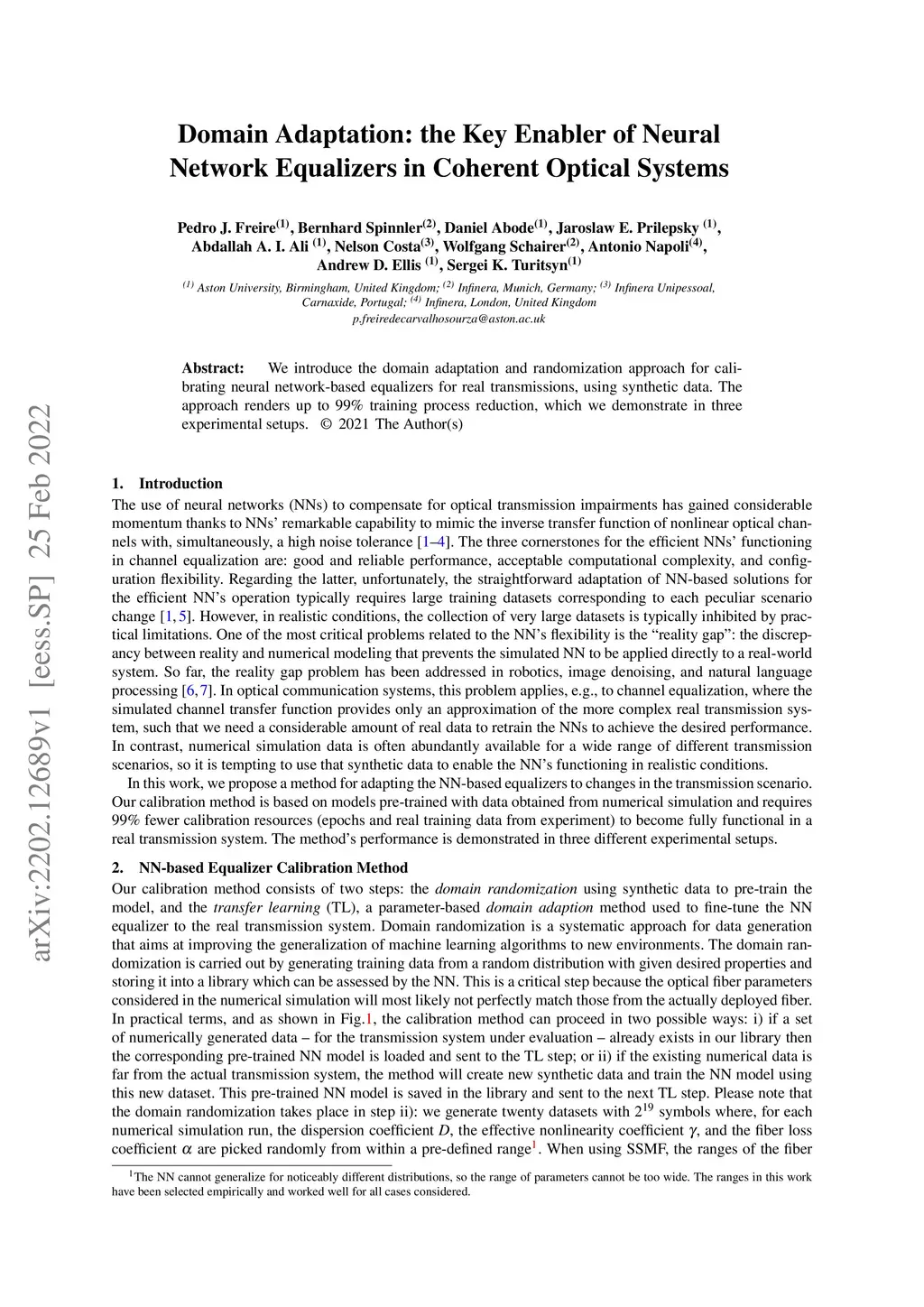 We introduce the domain adaptation and randomization approach for calibrating neural network-based equalizers for real transmissions, using synthetic data. The approach renders up to 99\% training process reduction, which we demonstrate in three experimental setups.