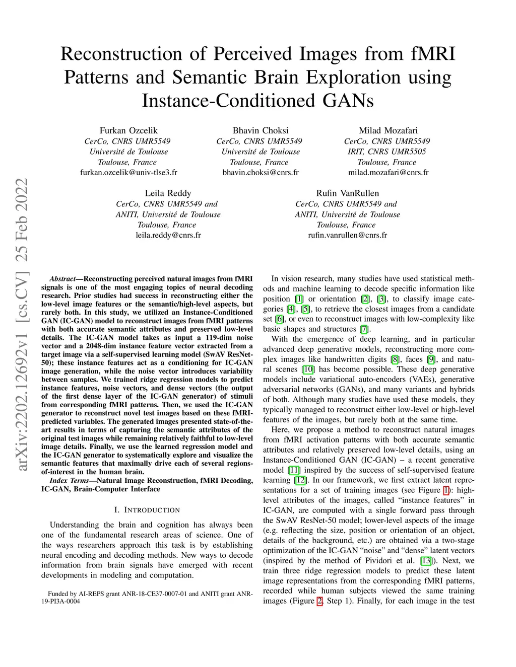 Reconstructing perceived natural images from fMRI signals is one of the most engaging topics of neural decoding research. Prior studies had success in reconstructing either the low-level image features or the semantic/high-level aspects, but rarely both. In this study, we utilized an Instance-Conditioned GAN (IC-GAN) model to reconstruct images from fMRI patterns with both accurate semantic attributes and preserved low-level details. The IC-GAN model takes as input a 119-dim noise vector and a 2048-dim instance feature vector extracted from a target image via a self-supervised learning model (SwAV ResNet-50); these instance features act as a conditioning for IC-GAN image generation, while the noise vector introduces variability between samples. We trained ridge regression models to predict instance features, noise vectors, and dense vectors (the output of the first dense layer of the IC-GAN generator) of stimuli from corresponding fMRI patterns. Then, we used the IC-GAN generator to reconstruct novel test images based on these fMRI-predicted variables. The generated images presented state-of-the-art results in terms of capturing the semantic attributes of the original test images while remaining relatively faithful to low-level image details. Finally, we use the learned regression model and the IC-GAN generator to systematically explore and visualize the semantic features that maximally drive each of several regions-of-interest in the human brain.