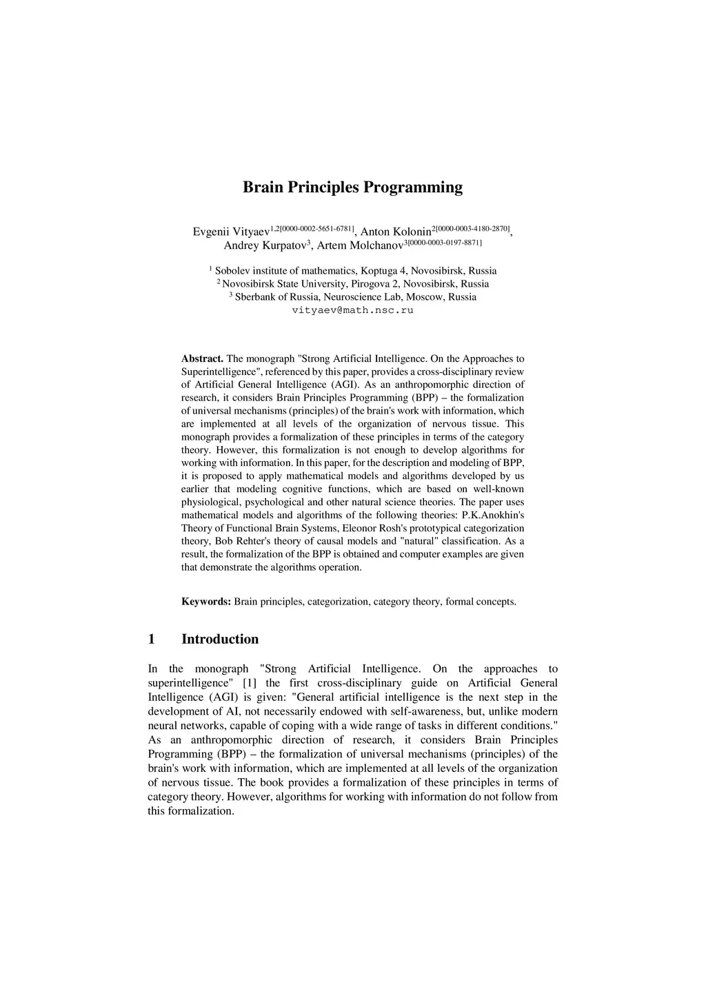 In the monograph, STRONG ARTIFICIAL INTELLIGENCE. On the Approaches to Superintelligence, published by Sberbank, provides a cross-disciplinary review of general artificial intelligence. As an anthropomorphic direction of research, it considers Brain Principles Programming, BPP) the formalization of universal mechanisms (principles) of the brain's work with information, which are implemented at all levels of the organization of nervous tissue. This monograph provides a formalization of these principles in terms of the category theory. However, this formalization is not enough to develop algorithms for working with information. In this paper, for the description and modeling of Brain Principles Programming, it is proposed to apply mathematical models and algorithms developed by us earlier that model cognitive functions, which are based on well-known physiological, psychological and other natural science theories. The paper uses mathematical models and algorithms of the following theories: P.K.Anokhin's Theory of Functional Brain Systems, Eleonor Rosh's prototypical categorization theory, Bob Rehter's theory of causal models and natural classification. As a result, the formalization of the BPP is obtained and computer examples are given that demonstrate the algorithm's operation.