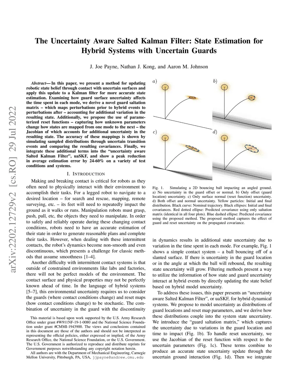 In this paper we present a method for updating robotic state belief through contact with uncertain surfaces and apply this update to a Kalman filter for more accurate state estimation. Examining how guard surface uncertainty affects the time spent in each mode, we derive a guard saltation matrix - which maps perturbations prior to hybrid events to perturbations after - accounting for additional variation in the resulting state. Additionally, we propose the use of parameterized reset functions - capturing how unknown parameters change how states are mapped from one mode to the next - the Jacobian of which accounts for the additional uncertainty in the resulting state. The accuracy of these mappings is shown by simulating sampled distributions through uncertain transition events and comparing the resulting covariances. Finally, we integrate these additional terms into the "uncertainty aware Salted Kalman Filter", uaSKF, and show a peak reduction in average estimation error by 24-60% on a variety of test conditions and systems.