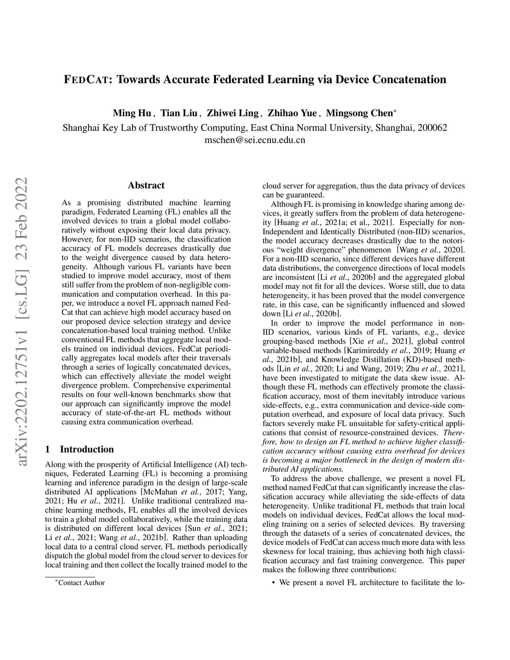 As a promising distributed machine learning paradigm, Federated Learning (FL) enables all the involved devices to train a global model collaboratively without exposing their local data privacy. However, for non-IID scenarios, the classification accuracy of FL models decreases drastically due to the weight divergence caused by data heterogeneity. Although various FL variants have been studied to improve model accuracy, most of them still suffer from the problem of non-negligible communication and computation overhead. In this paper, we introduce a novel FL approach named Fed-Cat that can achieve high model accuracy based on our proposed device selection strategy and device concatenation-based local training method. Unlike conventional FL methods that aggregate local models trained on individual devices, FedCat periodically aggregates local models after their traversals through a series of logically concatenated devices, which can effectively alleviate the model weight divergence problem. Comprehensive experimental results on four well-known benchmarks show that our approach can significantly improve the model accuracy of state-of-the-art FL methods without causing extra communication overhead.