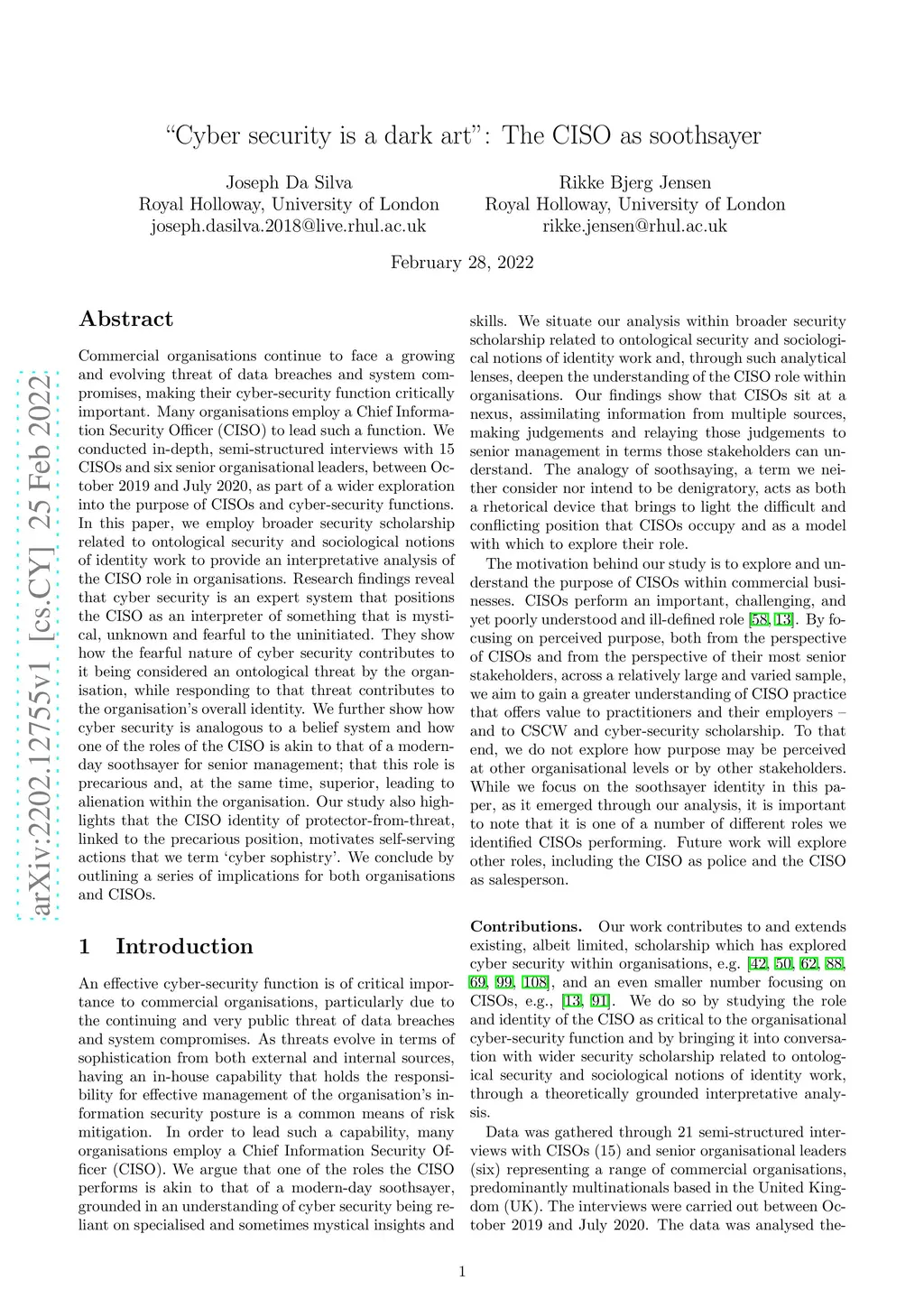 Commercial organisations continue to face a growing and evolving threat of data breaches and system compromises, making their cyber-security function critically important. Many organisations employ a Chief Information Security Officer (CISO) to lead such a function. We conducted in-depth, semi-structured interviews with 15 CISOs and six senior organisational leaders, between October 2019 and July 2020, as part of a wider exploration into the purpose of CISOs and cyber-security functions. In this paper, we employ broader security scholarship related to ontological security and sociological notions of identity work to provide an interpretative analysis of the CISO role in organisations. Research findings reveal that cyber security is an expert system that positions the CISO as an interpreter of something that is mystical, unknown and fearful to the uninitiated. They show how the fearful nature of cyber security contributes to it being considered an ontological threat by the organisation, while responding to that threat contributes to the organisation's overall identity. We further show how cyber security is analogous to a belief system and how one of the roles of the CISO is akin to that of a modern-day soothsayer for senior management; that this role is precarious and, at the same time, superior, leading to alienation within the organisation. Our study also highlights that the CISO identity of protector-from-threat, linked to the precarious position, motivates self-serving actions that we term `cyber sophistry'. We conclude by outlining a series of implications for both organisations and CISOs.