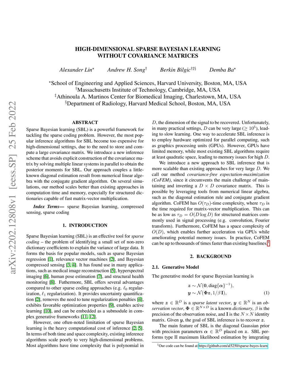 Sparse Bayesian learning (SBL) is a powerful framework for tackling the sparse coding problem. However, the most popular inference algorithms for SBL become too expensive for high-dimensional settings, due to the need to store and compute a large covariance matrix. We introduce a new inference scheme that avoids explicit construction of the covariance matrix by solving multiple linear systems in parallel to obtain the posterior moments for SBL. Our approach couples a little-known diagonal estimation result from numerical linear algebra with the conjugate gradient algorithm. On several simulations, our method scales better than existing approaches in computation time and memory, especially for structured dictionaries capable of fast matrix-vector multiplication.