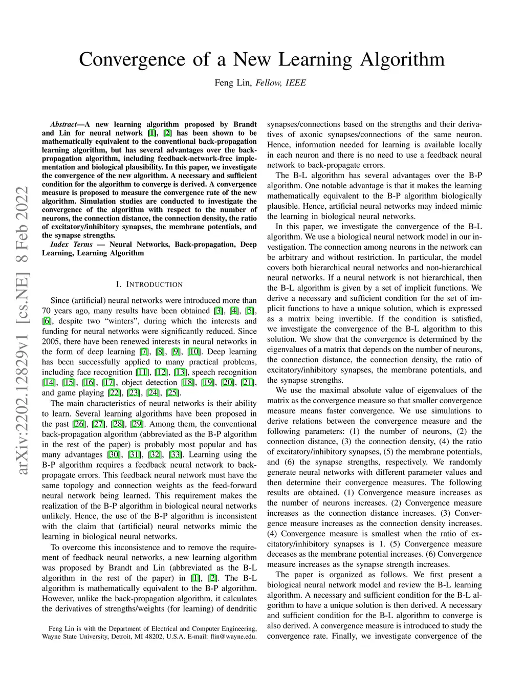 A new learning algorithm proposed by Brandt and Lin for neural network [1], [2] has been shown to be mathematically equivalent to the conventional back-propagation learning algorithm, but has several advantages over the backpropagation algorithm, including feedback-network-free implementation and biological plausibility. In this paper, we investigate the convergence of the new algorithm. A necessary and sufficient condition for the algorithm to converge is derived. A convergence measure is proposed to measure the convergence rate of the new algorithm. Simulation studies are conducted to investigate the convergence of the algorithm with respect to the number of neurons, the connection distance, the connection density, the ratio of excitatory/inhibitory synapses, the membrane potentials, and the synapse strengths.