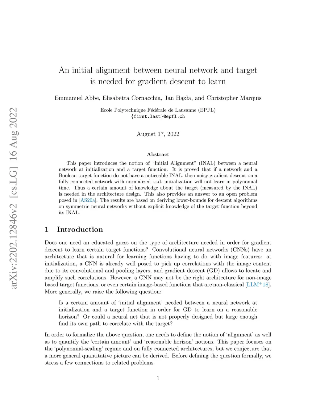 This paper introduces the notion of ``Initial Alignment'' (INAL) between a neural network at initialization and a target function. It is proved that if a network and a Boolean target function do not have a noticeable INAL, then noisy gradient descent on a fully connected network with normalized i.i.d. initialization will not learn in polynomial time. Thus a certain amount of knowledge about the target (measured by the INAL) is needed in the architecture design. This also provides an answer to an open problem posed in [AS20]. The results are based on deriving lower-bounds for descent algorithms on symmetric neural networks without explicit knowledge of the target function beyond its INAL.