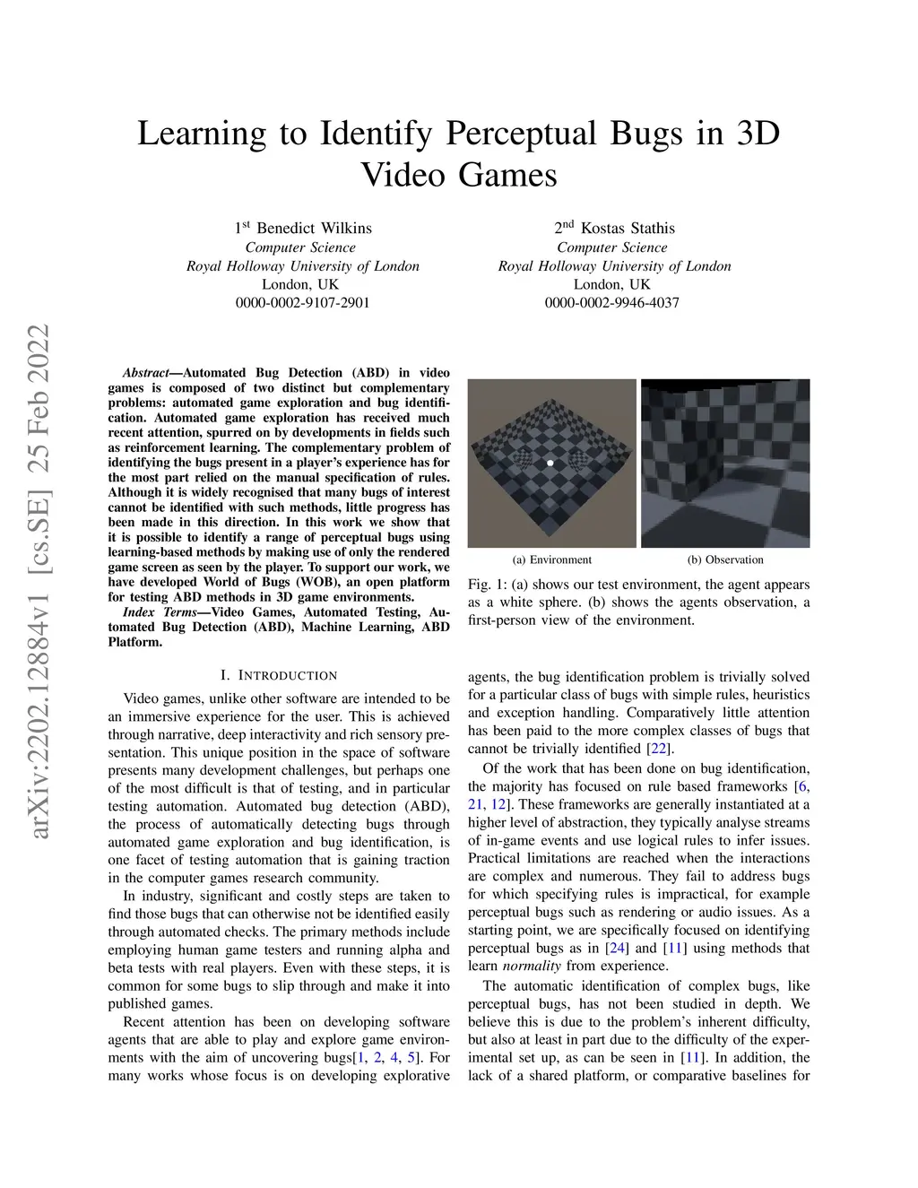 Automated Bug Detection (ABD) in video games is composed of two distinct but complementary problems: automated game exploration and bug identification. Automated game exploration has received much recent attention, spurred on by developments in fields such as reinforcement learning. The complementary problem of identifying the bugs present in a player's experience has for the most part relied on the manual specification of rules. Although it is widely recognised that many bugs of interest cannot be identified with such methods, little progress has been made in this direction. In this work we show that it is possible to identify a range of perceptual bugs using learning-based methods by making use of only the rendered game screen as seen by the player. To support our work, we have developed World of Bugs (WOB) an open platform for testing ABD methods in 3D game environments.