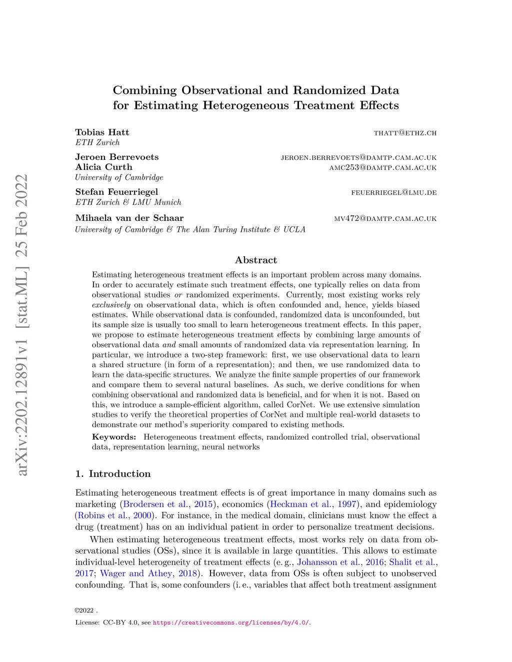 Estimating heterogeneous treatment effects is an important problem across many domains. In order to accurately estimate such treatment effects, one typically relies on data from observational studies or randomized experiments. Currently, most existing works rely exclusively on observational data, which is often confounded and, hence, yields biased estimates. While observational data is confounded, randomized data is unconfounded, but its sample size is usually too small to learn heterogeneous treatment effects. In this paper, we propose to estimate heterogeneous treatment effects by combining large amounts of observational data and small amounts of randomized data via representation learning. In particular, we introduce a two-step framework: first, we use observational data to learn a shared structure (in form of a representation); and then, we use randomized data to learn the data-specific structures. We analyze the finite sample properties of our framework and compare them to several natural baselines. As such, we derive conditions for when combining observational and randomized data is beneficial, and for when it is not. Based on this, we introduce a sample-efficient algorithm, called CorNet. We use extensive simulation studies to verify the theoretical properties of CorNet and multiple real-world datasets to demonstrate our method's superiority compared to existing methods.