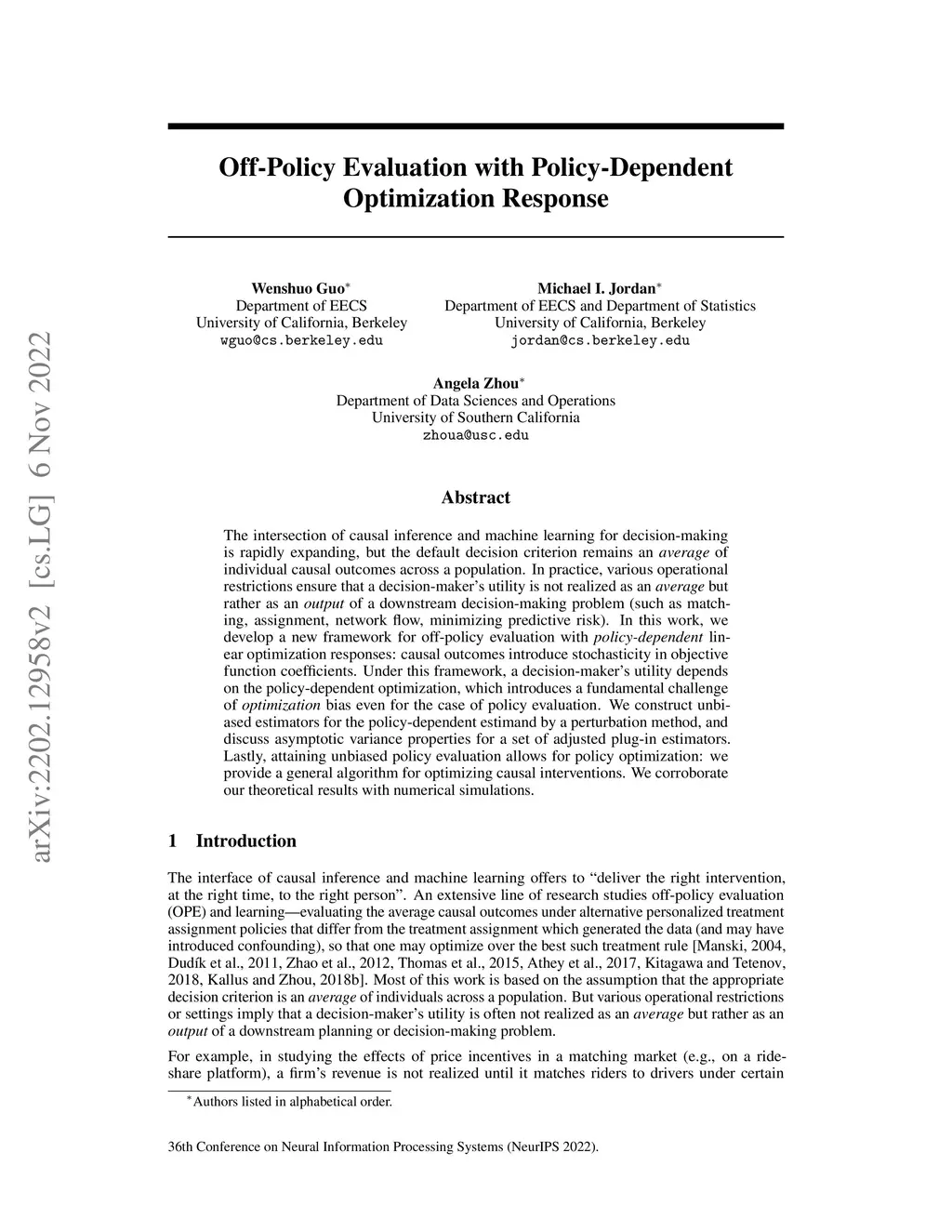The intersection of causal inference and machine learning for decision-making is rapidly expanding, but the default decision criterion remains an \textit{average} of individual causal outcomes across a population. In practice, various operational restrictions ensure that a decision-maker's utility is not realized as an \textit{average} but rather as an \textit{output} of a downstream decision-making problem (such as matching, assignment, network flow, minimizing predictive risk). In this work, we develop a new framework for off-policy evaluation with \textit{policy-dependent} linear optimization responses: causal outcomes introduce stochasticity in objective function coefficients. Under this framework, a decision-maker's utility depends on the policy-dependent optimization, which introduces a fundamental challenge of \textit{optimization} bias even for the case of policy evaluation. We construct unbiased estimators for the policy-dependent estimand by a perturbation method, and discuss asymptotic variance properties for a set of adjusted plug-in estimators. Lastly, attaining unbiased policy evaluation allows for policy optimization: we provide a general algorithm for optimizing causal interventions. We corroborate our theoretical results with numerical simulations.