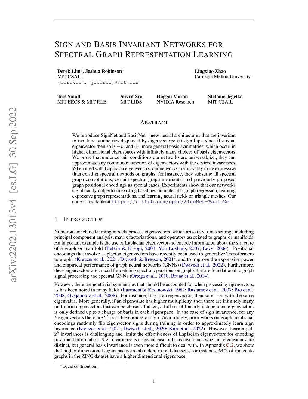 We introduce SignNet and BasisNet -- new neural architectures that are invariant to two key symmetries displayed by eigenvectors: (i) sign flips, since if is an eigenvector then so is ; and (ii) more general basis symmetries, which occur in higher dimensional eigenspaces with infinitely many choices of basis eigenvectors. We prove that under certain conditions our networks are universal, i.e., they can approximate any continuous function of eigenvectors with the desired invariances. When used with Laplacian eigenvectors, our networks are provably more expressive than existing spectral methods on graphs; for instance, they subsume all spectral graph convolutions, certain spectral graph invariants, and previously proposed graph positional encodings as special cases. Experiments show that our networks significantly outperform existing baselines on molecular graph regression, learning expressive graph representations, and learning neural fields on triangle meshes. Our code is available at https://github.com/cptq/SignNet-BasisNet .