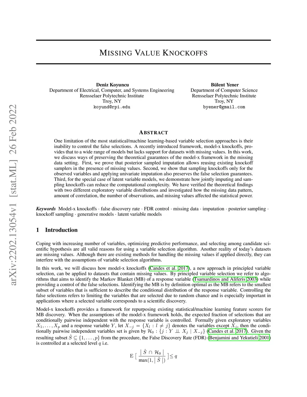 One limitation of the most statistical/machine learning-based variable selection approaches is their inability to control the false selections. A recently introduced framework, model-x knockoffs, provides that to a wide range of models but lacks support for datasets with missing values. In this work, we discuss ways of preserving the theoretical guarantees of the model-x framework in the missing data setting. First, we prove that posterior sampled imputation allows reusing existing knockoff samplers in the presence of missing values. Second, we show that sampling knockoffs only for the observed variables and applying univariate imputation also preserves the false selection guarantees. Third, for the special case of latent variable models, we demonstrate how jointly imputing and sampling knockoffs can reduce the computational complexity. We have verified the theoretical findings with two different exploratory variable distributions and investigated how the missing data pattern, amount of correlation, the number of observations, and missing values affected the statistical power.