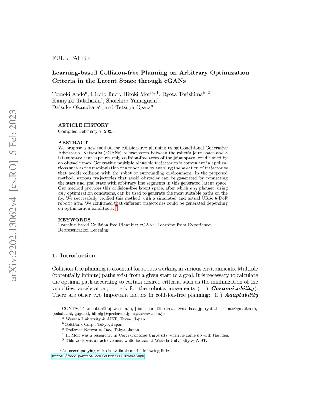 We propose a new method for collision-free planning using Conditional Generative Adversarial Networks (cGANs) to transform between the robot's joint space and a latent space that captures only collision-free areas of the joint space, conditioned by an obstacle map. Generating multiple plausible trajectories is convenient in applications such as the manipulation of a robot arm by enabling the selection of trajectories that avoids collision with the robot or surrounding environment. In the proposed method, various trajectories that avoid obstacles can be generated by connecting the start and goal state with arbitrary line segments in this generated latent space. Our method provides this collision-free latent space, after which any planner, using any optimization conditions, can be used to generate the most suitable paths on the fly. We successfully verified this method with a simulated and actual UR5e 6-DoF robotic arm. We confirmed that different trajectories could be generated depending on optimization conditions.