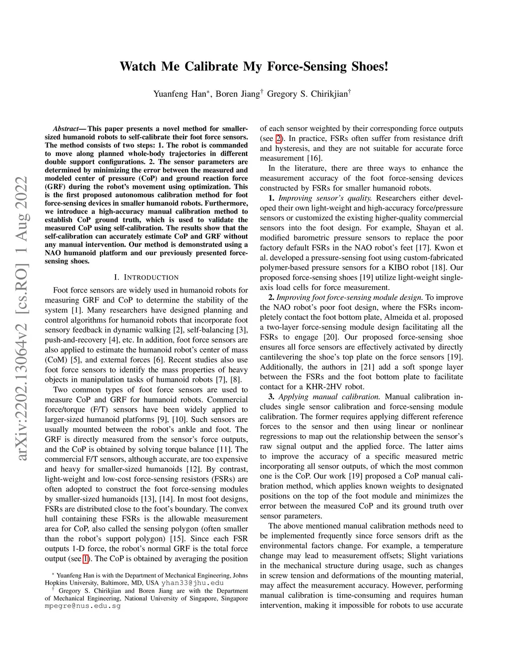 This paper presents a novel method for smaller-sized humanoid robots to self-calibrate their foot force sensors. The method consists of two steps: 1. The robot is commanded to move along planned whole-body trajectories in different double support configurations. 2. The sensor parameters are determined by minimizing the error between the measured and modeled center of pressure (CoP) and ground reaction force (GRF) during the robot's movement using optimization. This is the first proposed autonomous calibration method for foot force-sensing devices in smaller humanoid robots. Furthermore, we introduce a high-accuracy manual calibration method to establish CoP ground truth, which is used to validate the measured CoP using self-calibration. The results show that the self-calibration can accurately estimate CoP and GRF without any manual intervention. Our method is demonstrated using a NAO humanoid platform and our previously presented force-sensing shoes.
