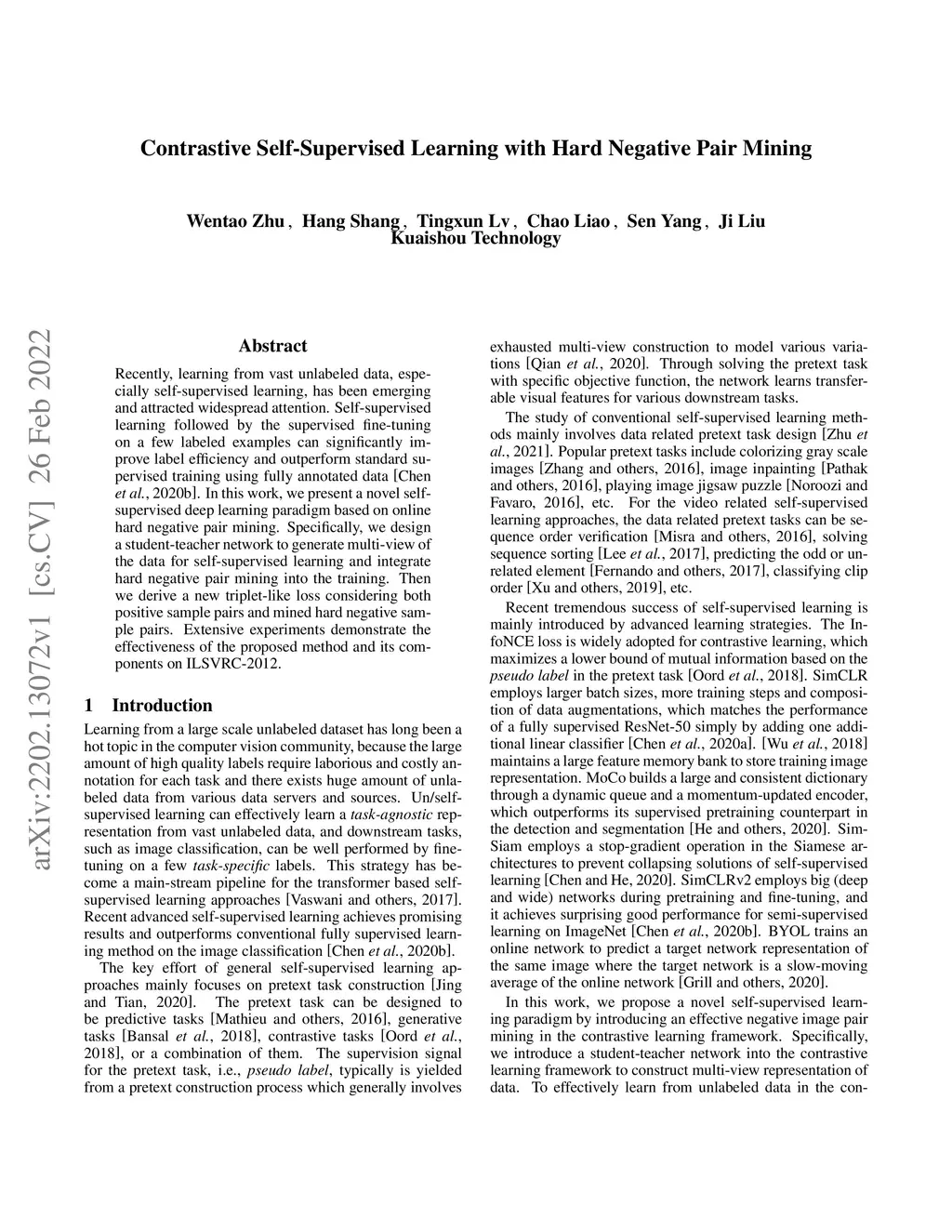 Recently, learning from vast unlabeled data, especially self-supervised learning, has been emerging and attracted widespread attention. Self-supervised learning followed by the supervised fine-tuning on a few labeled examples can significantly improve label efficiency and outperform standard supervised training using fully annotated data. In this work, we present a novel self-supervised deep learning paradigm based on online hard negative pair mining. Specifically, we design a student-teacher network to generate multi-view of the data for self-supervised learning and integrate hard negative pair mining into the training. Then we derive a new triplet-like loss considering both positive sample pairs and mined hard negative sample pairs. Extensive experiments demonstrate the effectiveness of the proposed method and its components on ILSVRC-2012.