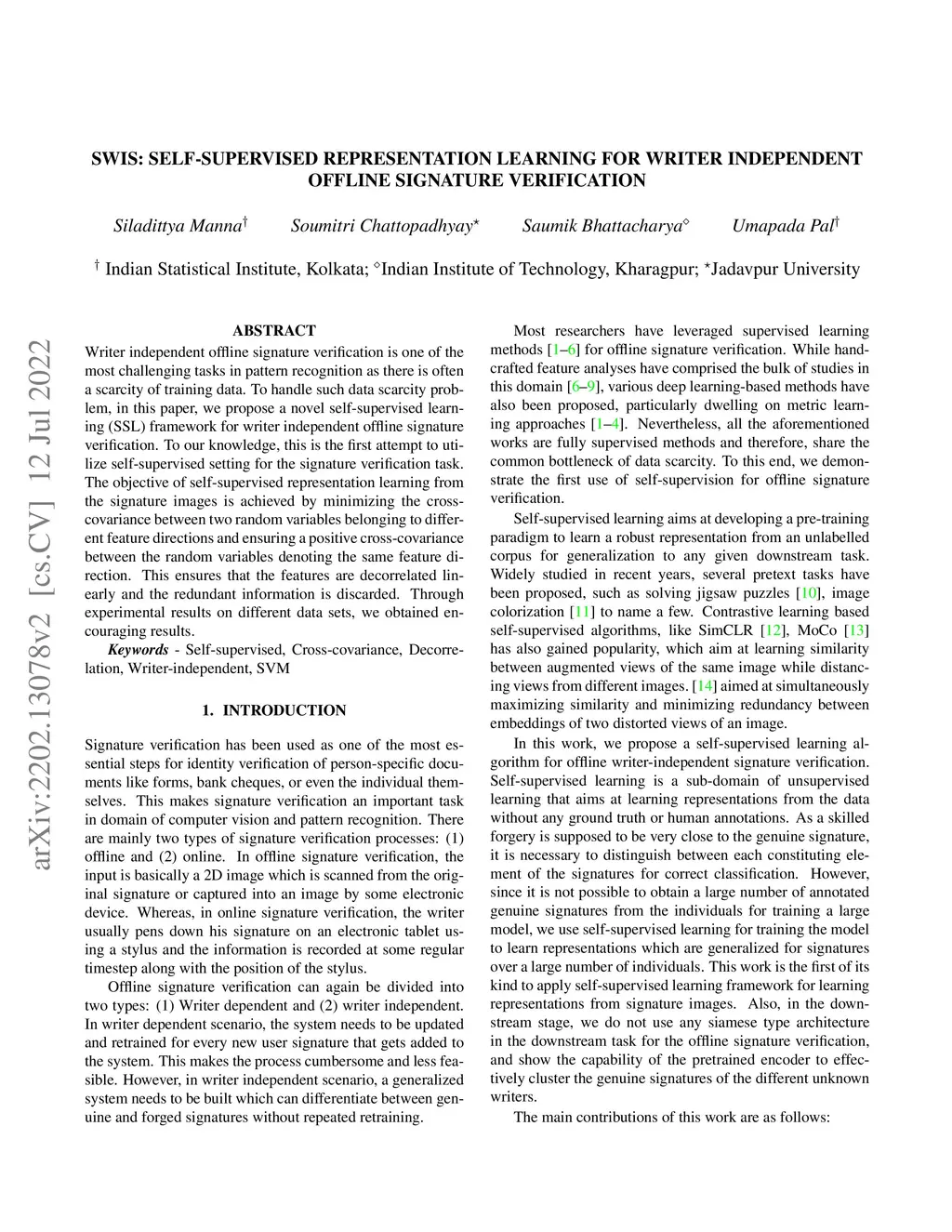 SWIS: Self-Supervised Representation Learning For Writer Independent