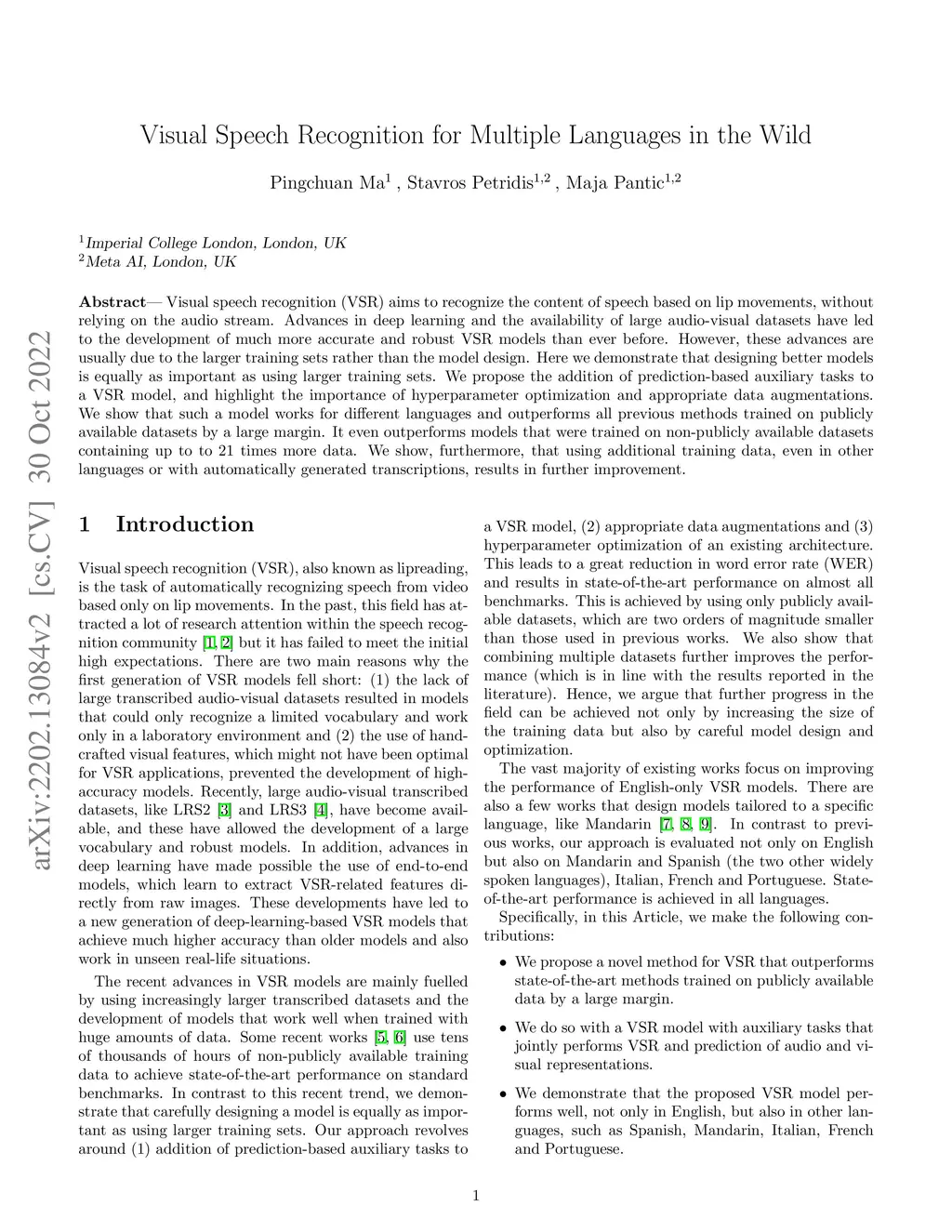Visual speech recognition (VSR) aims to recognize the content of speech based on lip movements, without relying on the audio stream. Advances in deep learning and the availability of large audio-visual datasets have led to the development of much more accurate and robust VSR models than ever before. However, these advances are usually due to the larger training sets rather than the model design. Here we demonstrate that designing better models is equally as important as using larger training sets. We propose the addition of prediction-based auxiliary tasks to a VSR model, and highlight the importance of hyperparameter optimization and appropriate data augmentations. We show that such a model works for different languages and outperforms all previous methods trained on publicly available datasets by a large margin. It even outperforms models that were trained on non-publicly available datasets containing up to to 21 times more data. We show, furthermore, that using additional training data, even in other languages or with automatically generated transcriptions, results in further improvement.