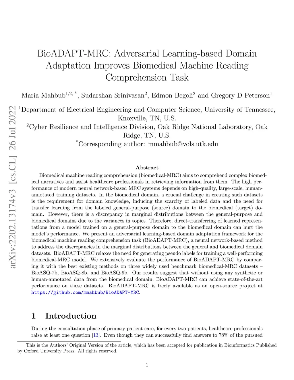 BioADAPT-MRC: Adversarial Learning-based Domain Adaptation Improves