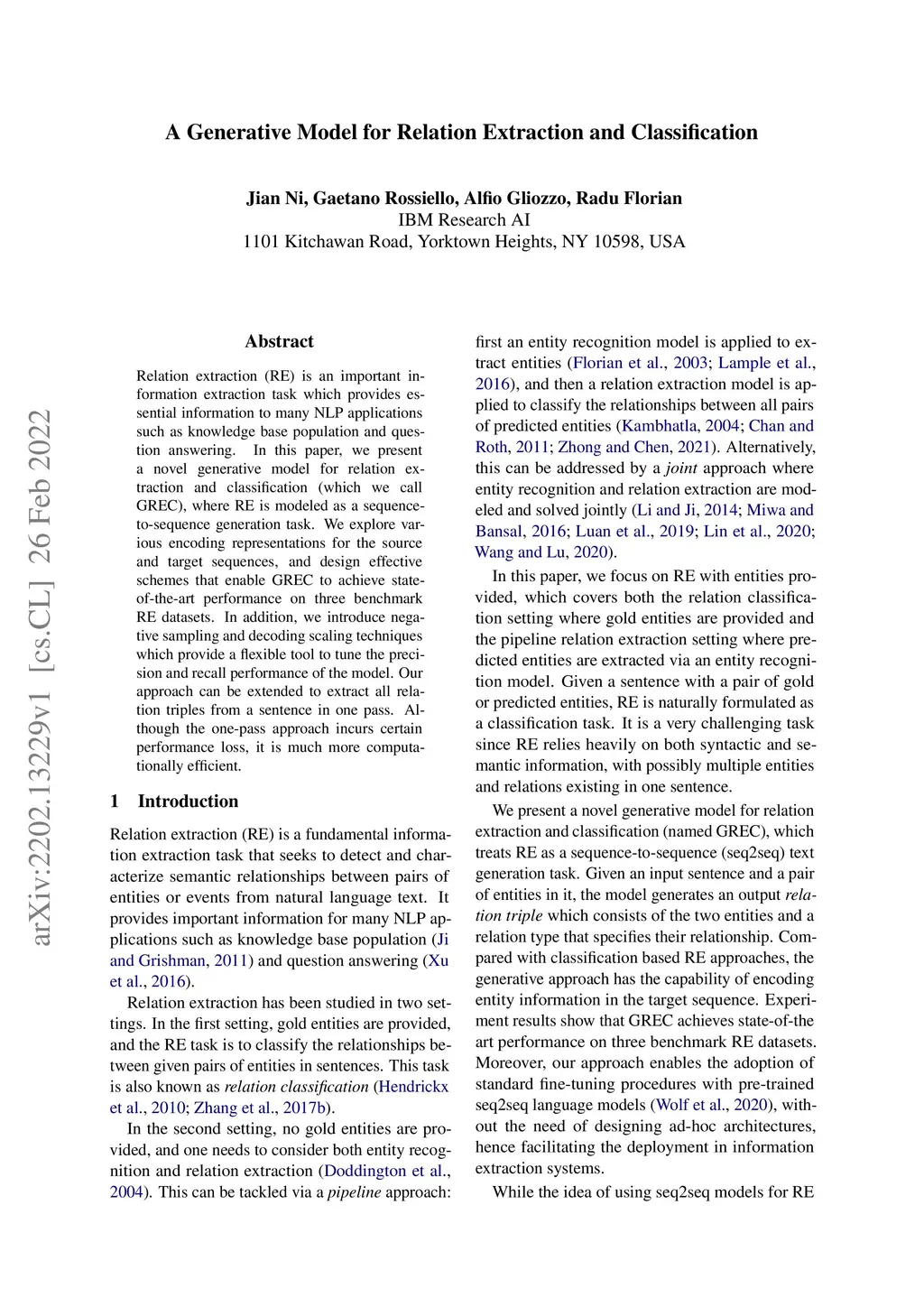 Relation extraction (RE) is an important information extraction task which provides essential information to many NLP applications such as knowledge base population and question answering. In this paper, we present a novel generative model for relation extraction and classification (which we call GREC), where RE is modeled as a sequence-to-sequence generation task. We explore various encoding representations for the source and target sequences, and design effective schemes that enable GREC to achieve state-of-the-art performance on three benchmark RE datasets. In addition, we introduce negative sampling and decoding scaling techniques which provide a flexible tool to tune the precision and recall performance of the model. Our approach can be extended to extract all relation triples from a sentence in one pass. Although the one-pass approach incurs certain performance loss, it is much more computationally efficient.